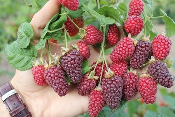 Плоды собраны в гроздья по 5-7 штук. В период спелости они окрашены в насыщенный малиновый цвет, у них конусообразная форма. Размер достигает до 4 см, а вес – около 8 г, что делает их крупными. Вкус сладкий и сочный, с выраженным малинным ароматом.