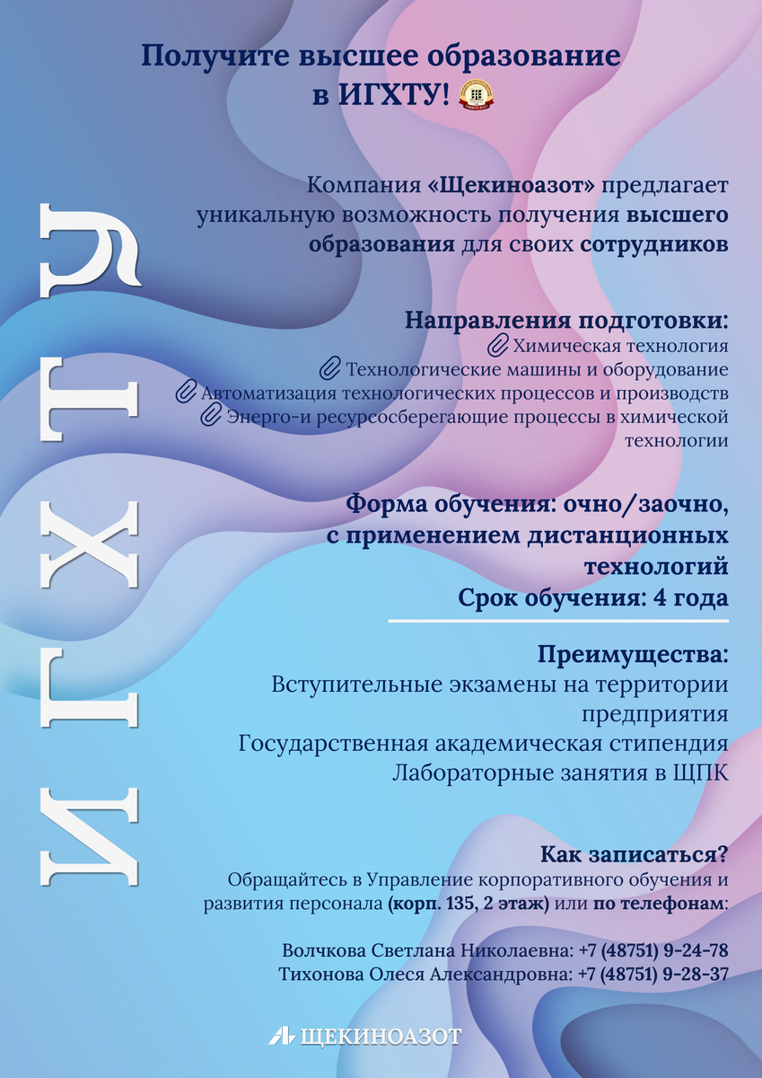 Предлагаем сотрудникам компании «Щекиноазот» рассмотреть возможность получения высшего профессионального образования в ИГХТУ. Компания «Щекиноазот» продолжает поддерживать профессиональный рост своих будущих и нынешних сотрудников! Недавно состоялась встреча с выпускниками Щекинского политехнического колледжа, где представители кадровой службы рассказали о возможности получения высшего образования в вузе-партнере предприятия - Ивановском государственном химико-технологическом университете (ИГХТУ). Многие выпускники сразу заинтересовались этой перспективой. Для желающих поступить в университет будет организована возможность пройти тестирование, не уезжая в ИГХТУ (представители вуза приедут в г. Щекино). «Щекиноазот» предлагает и своим действующим сотрудникам рассмотреть возможность обучения в ИГХТУ для повышения квалификации и карьерного роста! Обучение осуществляется по очной и заочной форме. ИГХТУ предлагает гибкую систему индивидуальных траекторий обучения, в том числе с применением