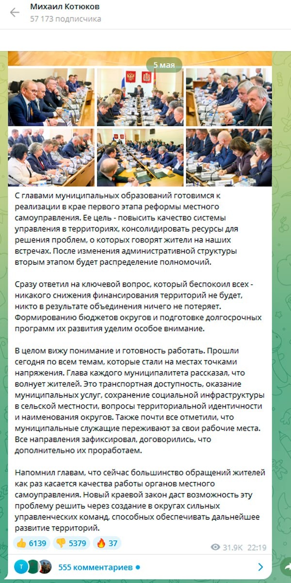 В ответ на пост 🤦🏻♂️ Красноярскому губернатору «накрутили» тысячи лайков под постом о скандальной реформе Тысячи лайков вдруг появились под публикацией губернатора Красноярского края Михаила Котюкова в телеграме, которая оправдывает муниципальную реформу в регионе. Жители уже вторую неделю записывают массовые обращения против законопроекта. Ещё утром 7 мая у поста было всего 169 лайков и около 5 тыс. дизлайков. Но через несколько часов количество лайков превысило 6 тыс. Хотя количество просмотров поста осталось примерно на том же уровне — около 30-31 тыс. Впрочем, под постом остались сотни негативных комментариев с критикой действий губернатора-единоросса. Пользователи уже обратили внимание на возможную накрутку в канале Котюкова. 📌 Законопроект, иницированный губернатором, предполагает, что вместо 472 муниципальных образований в крае будет только 39. Ликвидируются все сельсоветы и советы депутатов большинства крупных городов — Ачинска, Минусинска и других. В муниципальных окру
