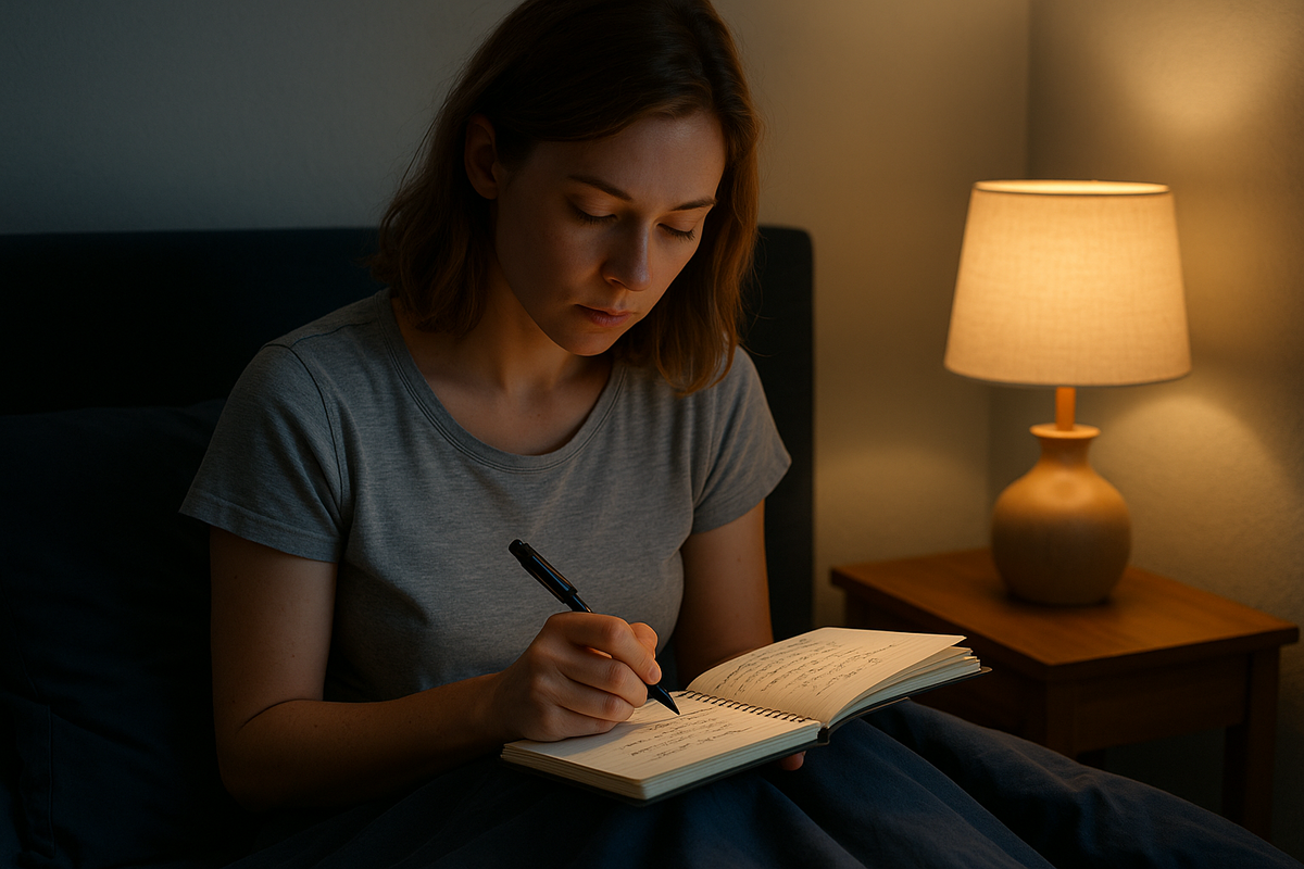 Это снижает уровень кортизола (гормона тревоги) и помогает выработке мелатонина — гормона сна. Сядь за 10 минут до сна и выпиши всё, что тревожит: Это называется «внешняя память» — помогает мозгу отпустить ненужное и заснуть спокойно.