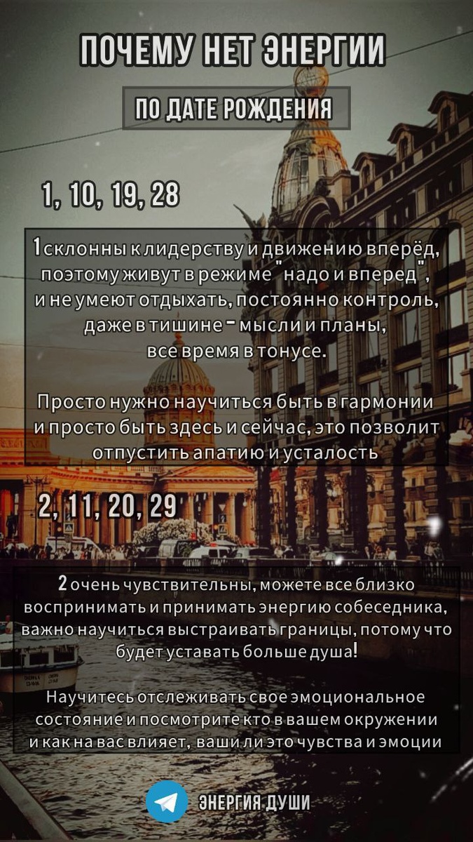 💥 ПОЧЕМУ нет ЭНЕРГИИ и СИЛ по Дате Рождения Иногда бывает раз... и откат..., нет сил и энергии... и начинаем искать - почему так? А ответ то порой очень простой... заглянуть просто стоит в свою Дату Рождения И начать с первопричины - источника - что произошло и почему так постоянно получается... И в этот момент важно сразу вытащить себя с этого состояния... Если чувствуете, что постоянно происходит откат - нет сил и энергии, стоит обратиться к цифрам! к нашей ДАТЕ рождения - это основное наше предназначение и возвращаясь к ней мы можем понять источник состояния #Энергии на всю жизнь... ................................................. ✅ Сделала для вас подборку по датам рождения Знание о своей истинной силе и энергии, определяемой через #квантовуюнумерологию, дает возможность глубже понять себя 📌 Обязательно сохраните пост и отправьте близким, чтобы они тоже знали, как им прийти к своим желаниям! P.s. напомню, что можете приобрести гайд - "Ваш источник энергии по Дате Рожд