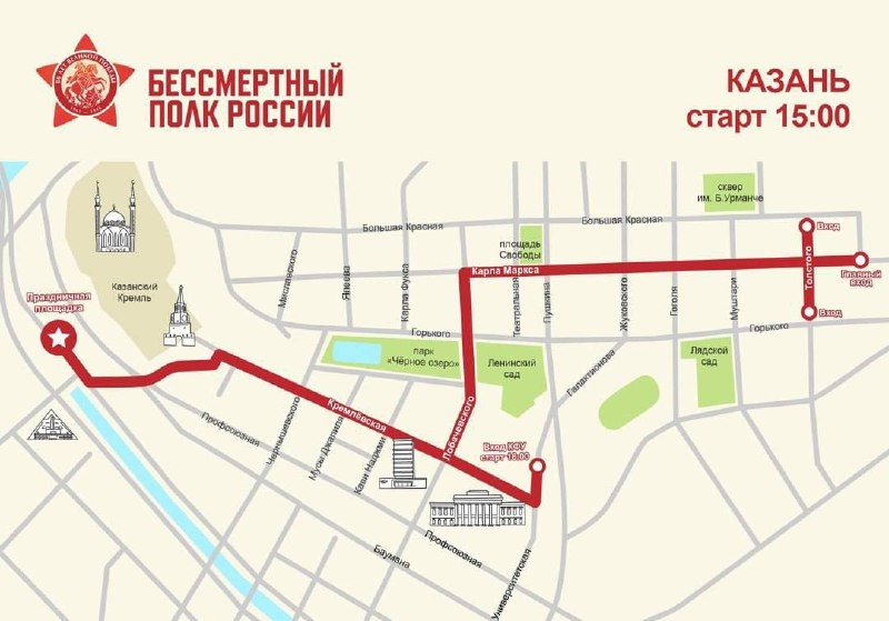 💪Почтите память героев вашей семьи –присоединяйтесь к Бессмертному полку в Казани Великая Победа навсегда в наших сердцах. Вы можете выразить благодарность ветеранам и труженикам тыла за их беспримерный подвиг, за подаренную нам возможность жить. Примите участие в шествии «Бессмертного полка» в Казани. Маршрут шествия затронет центральные улицы города: 🔻Толстого 🔻Карла Маркса 🔻Лобачевского 🔻Кремлевская Старт: 📍Ул.Толстого в 15:00 Не забудьте подготовить штендер с портретом героя Великой Отечественной войны. Оформить его в стиле 80-тилетия победы можно на официальном сайте Бессмертного полка РФ Абау