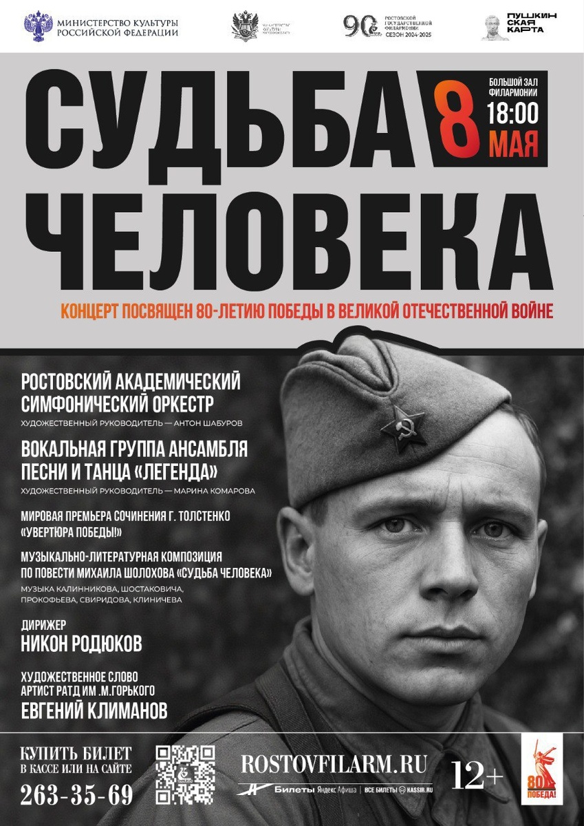 ◽️К 80-летию Великой Победы и 120-летию со дня рождения Михаила Шолохова в филармонии пройдет концерт «Судьба человека». Музыкально-литературную композицию по мотивам рассказа представит Ростовский академический симфонический оркестр, вокальная группа ансамбля песни и пляски «Легенда» и артист театра им. М. Горького Евгений Климанов. Прозвучит музыка Прокофьева, Шостаковича, Свиридова, Клиничева и Калинникова. Также в программе: мировая премьера «Увертюры Победы» Геннадия Толстенко. Дирижер — Никон Родюков.