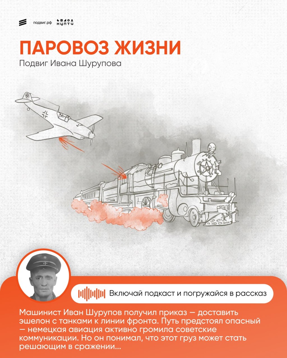 «В своих поездах ты везешь не только танки, но и освобождение, жизнь и счастье миллионов» Шурупов получил приказ доставить на Сталинградский фронт танковый эшелон. В результате обстрела вражеским самолетов паровоз был поврежден, а машинист Шурупов тяжело ранен. Но раненый Иван попросил товарищей поднять его в кабину и начал движение. Машинист довел состав до лесопосадки. В госпитале врачи не могли поверить, что с такими ранениями он смог вести эшелон. Читать художественный рассказ о подвиге Ивана 💛 Подписаться на Подвиг.РФ #подвигрф #подвигрф_про_людей #ВеликаяОтечественнаявойна