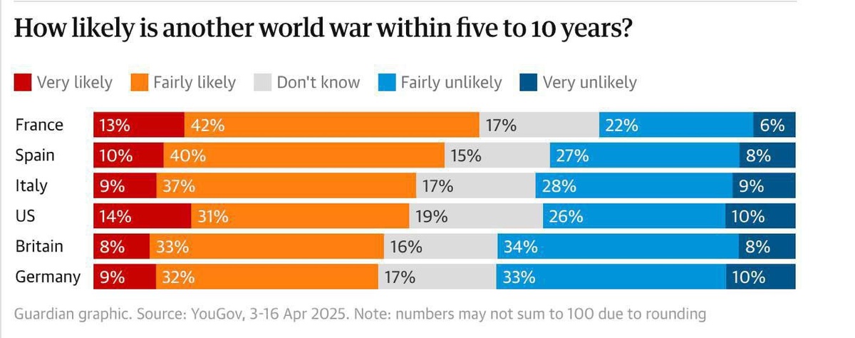 Европа и США ждут Третьей мировой: страхи усиливаются Восемь десятилетий спустя после окончания Второй мировой войны все больше жителей Запада уверены: новая глобальная война — вопрос времени. Согласно свежим опросам, от 41% до 55% респондентов в Великобритании, Франции, Германии, Италии и Испании считают, что в ближайшие 5–10 лет может вспыхнуть Третья мировая. Подобного мнения придерживаются и 45% американцев. Главным источником возможного конфликта большинство называют обострение отношений с Россией. Особую тревогу вызывает тот факт, что от 68% до 76% опрошенных считают новый конфликт потенциально ядерным. Мир словно возвращается в эпоху тревожного ожидания — только на этот раз ядерная угроза воспринимается как почти неизбежная.