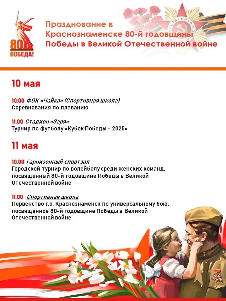 🇷🇺 Уважаемые краснознаменцы! 9️⃣ Представляем вашему вниманию афишу общегородских праздничных мероприятий 9 мая, посвященных 80-й годовщине Победы в Великой Отечественной войне. (c) Администрация городского округа Краснознаменск t.me/krasnoznamensk_news