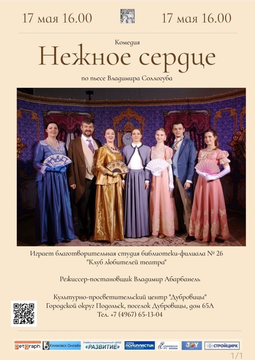 ✨ Спектакль Беда от нежного сердца💘 💲Тамбовский миллионер Василий Петрович Золотников ищет в столичном Петербурге невесту для своего сына Александра, у которого такое нежное сердце, что он делает предложение каждой девушке, с которой знакомится. 💍В итоге ему приходится выбирать из трех невест, но как определить, им нравится его богатство или он сам? Отец находит выход… 🎟️Пригласительные билеты можно получить у администратора в фойе главного корпуса Центра. 🚫 Возраст: 12+ 📆 17.05.2025 🕒 16:00 🏢 Культурно-просветительский центр "Дубровицы" 📍 г.о. Подольск, поселок Дубровицы, д. 65А 💰 Вход свободный❗️ #webПодольск ✅ Мероприятия Подольск https://dzen.ru/id/66ed500f7b5671493eca3fd6 http://vk.com/podolsk_events http://dzen.ru/podolsk_events