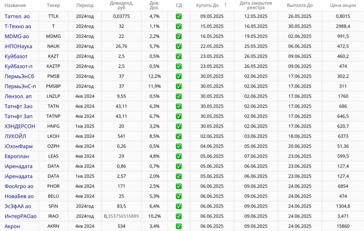 На нашем фондовом рынке, коллеги, стартует самый важный период времени в году — сезон выплаты дивидендов, активная фаза которого заканчивается во второй половине июля. Для начала рассмотрим период до начала июня: 🔜 Май 2025 📱 #TTLK Таттелеком — Последний день покупки: 8 мая. Дивиденды: ₽0,03775 на акцию. Доходность: 4,9% 🏦 #T Т-Технологии — Последний день покупки: 15 мая. Дивиденды: ₽32 на акцию. Доходность: 1% 🩺 #MDMG МД Медикал Груп — Последний день покупки: 16 мая. Дивиденды: ₽22 на акцию. Доходность: 2,3% 🔬 #NAUK НПО "Наука" — Последний день покупки: 22 мая. Дивиденды: ₽26,76 на акцию. Доходность: 5,5% 🧪 #KAZT КуйбышевАзот — Последний день покупки: 23 мая. Дивиденды: ₽2,5 на акцию. Доходность: 0,5% (обыкн. и прив.) 🔌 #TGKN ТГК-14 — Последний день покупки: 23 мая. Дивиденды: ₽0,00068864 на акцию. Доходность: 8,5% ⛽️ #TATN Татнефть — Последний день покупки: 30 мая. Дивиденды: ₽43,11 на акцию. Доходность: 6,1% (обыкн.), 6,4% (прив.) 🥇 #LNZL Лензолото — Последний день покупки:
