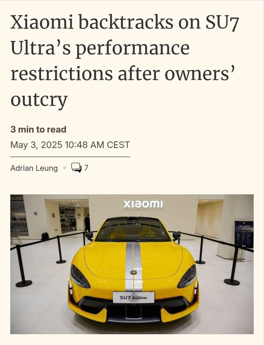 🏎Как Xiaomi поиграла в Бога с владельцами SU7 Ultra Ситуация произошла с владельцами машины, так как я смотрел на такую, не могу не поделиться: 1. «Добро пожаловать в будущее, где ваш спорткар — не ваш» Китайцы, блин, снова отличились. Только представьте: вы копили-копили, откладывали с зарплаты, продали почку (ну ладно, не почку, но старую Tesla точно), и вот она — ваша новая Xiaomi SU7 Ultra. 1548 лошадиных сил, разгон до сотни за 2.3 секунды, внешность как у суперкара за вдвое меньшие деньги. Вы уже чувствуете себя кибергонщиком из «Форсажа», только без Вин Дизеля и его вечных проблем с законом. Но тут… бац! И ваша тачка внезапно превращается в урезанную версию для пенсионеров. 2. «Обновление безопасности» или «Как нас поимели» Однажды утром владельцы SU7 Ultra получили «важное обновление». Ну, думают, ну наконец-то починят тот глюк с проектором фар, который иногда рисует на дороге непонятные иероглифы (наверное, китайские мемы). Но нет. После загрузки прошивки машина резко