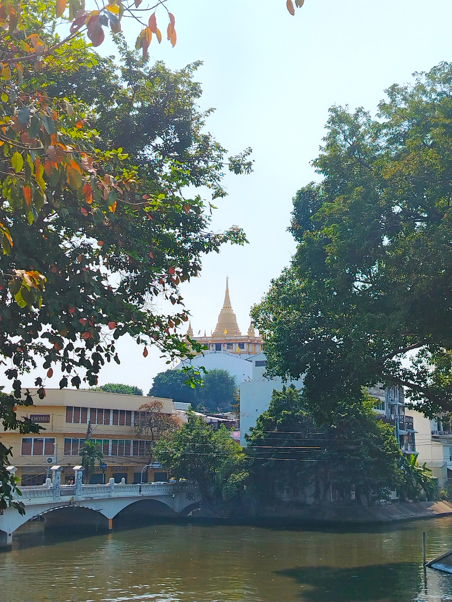 Храмов в Бангкоке множество. Есть скромные, а есть поражающие помпезностью и богатством. Есть типичные и есть нестандартные. К последним относится храм Ват Сакет - Wat Saket или Golden Mount, что по-русски означает Храм Золотой горы. Этот храм полюбился мне с первой же встречи еще в 2010 году, и с тех пор практически каждый раз, бывая в Бангкоке и останавливаясь на Каосане, я хожу в этот храм. Храм появился в этом месте в XVIIвеке, хотя не исключено, что и раньше. Особенностью храма является то, что расположен он на искусственной горе, точнее, холме высотой 60 метров. Основное сооружение храма - это огромная золотая ступа, или чеди, которая венчает гору и видна издалека. Отсюда и название храма – Золотой горы. Но храм расположен не только на горе, начинается он у ее подножия, поэтому правильнее говорить о храмовом комплексе. Вокруг горы, по окружности, расположено несколько зданий, напоминающих небольшие храмы. Здесь и библиотека, и административное помещение, помещения для монахов, п