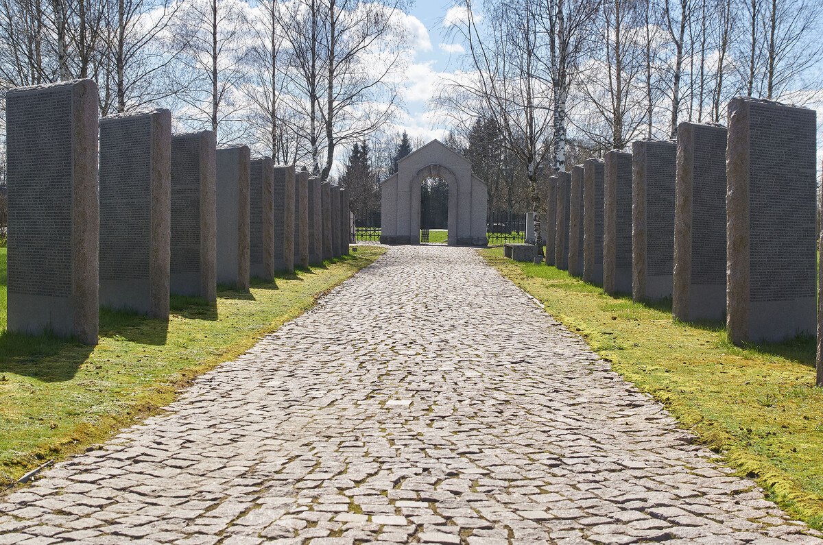 По-немецки аккуратный и ухоженный огромный участок земли, рассчитанный на 80 тысяч захоронений. Сегодня здесь покоятся останки более чем 50 тысяч солдат и офицеров, погибших в наших краях начиная с лета 1941 года и до момента изгнания фашистов с ленинградской земли зимой 1944-го. Вход на захоронение под каменной аркой, рядом с которой информационная табличка на трёх языках – русском, немецком и английском. И обозначение организации. Которая отвечает за захоронение – Volksbund Deutsche Kriegsgräberfürsorge – Народный союз Германии по уходу за военными захоронениями.