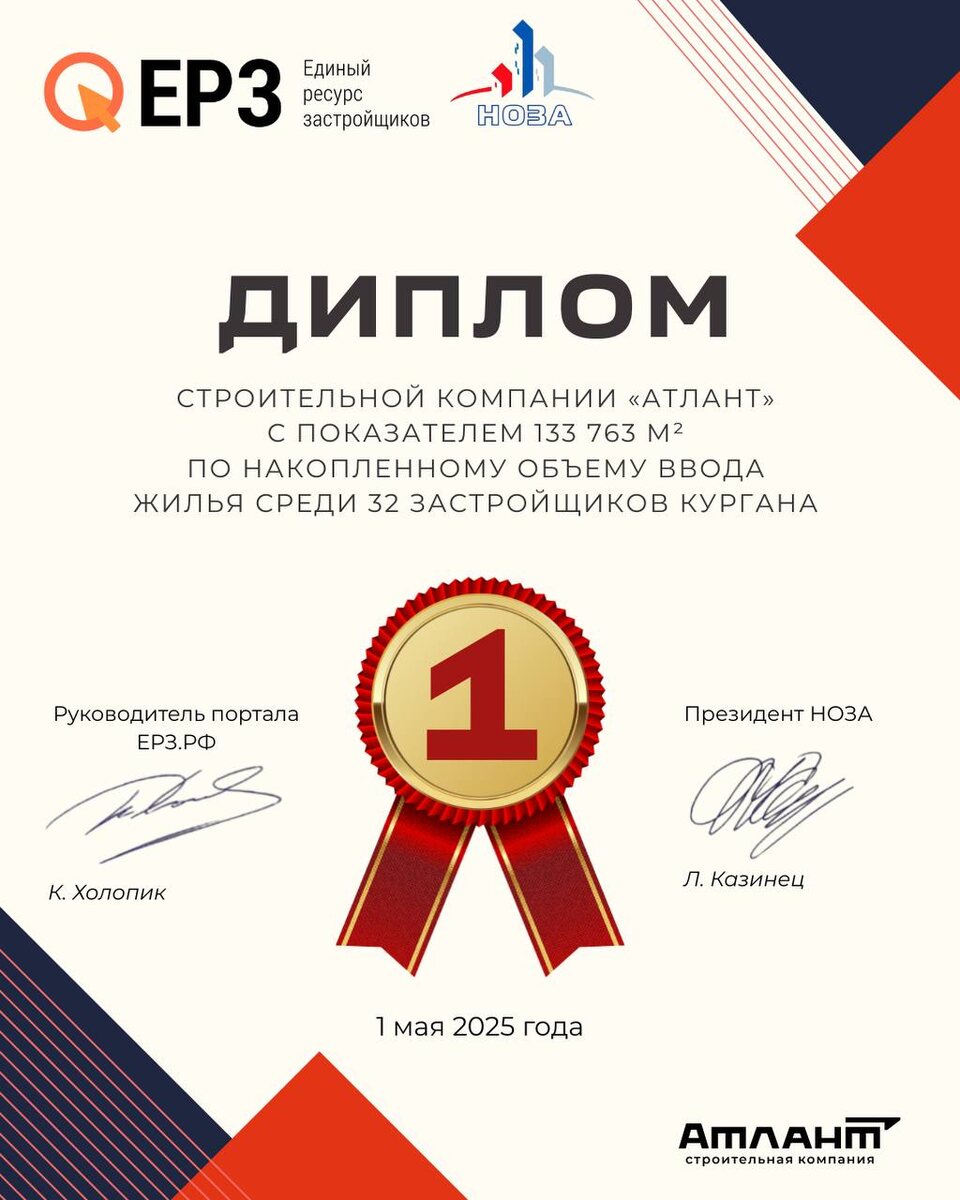 🥇 Строительная компания «Атлант» — ТОП-1 среди всех застройщиков Кургана по объему ввода жилья Продолжаем удивлять и радовать вас новостями нашей компании! Главный портал застройщиков ЕРЗ.РФ опубликовал свежий отчет от 1 мая 2025 года по объему введенных в эксплуатацию квадратных метров жилья с 2016 года. 🏆 «Атлант» занял первое место с показателем 133 763 м² — это 20 сданных многоквартирных домов в городе Кургане. Это достижение для нас — не просто цифра, а подтверждение того, что мы движемся в правильном направлении. Мы всегда стремимся расти, делать лучше и качественнее. Для нас важно не только быть лидерами, но и, в первую очередь, оправдывать доверие жильцов, которые выбирают наши дома для своего счастливого будущего. Поэтому только вперед — к новым задачам, высотам и проектам, которые меняют облик любимого города и задают новый уровень жизни 🔝
