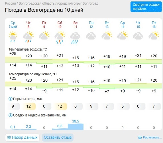 А вот день порадует жителей отдаленных от миллионника районов отсутствием осадков и температурой от +17 до +22 тепла. Волгоградцы будут встречать праздничное утро 9 мая, пережив ночной дождь. Он будет идти при порывах северо-западного ветра, западного ветра до 13 м/с. Прогнозируется небольшим. Похолодает в городе до +11. В дневные часы погода подготовила отдыхающим горожанам подарок — без осадков и температура до +21.