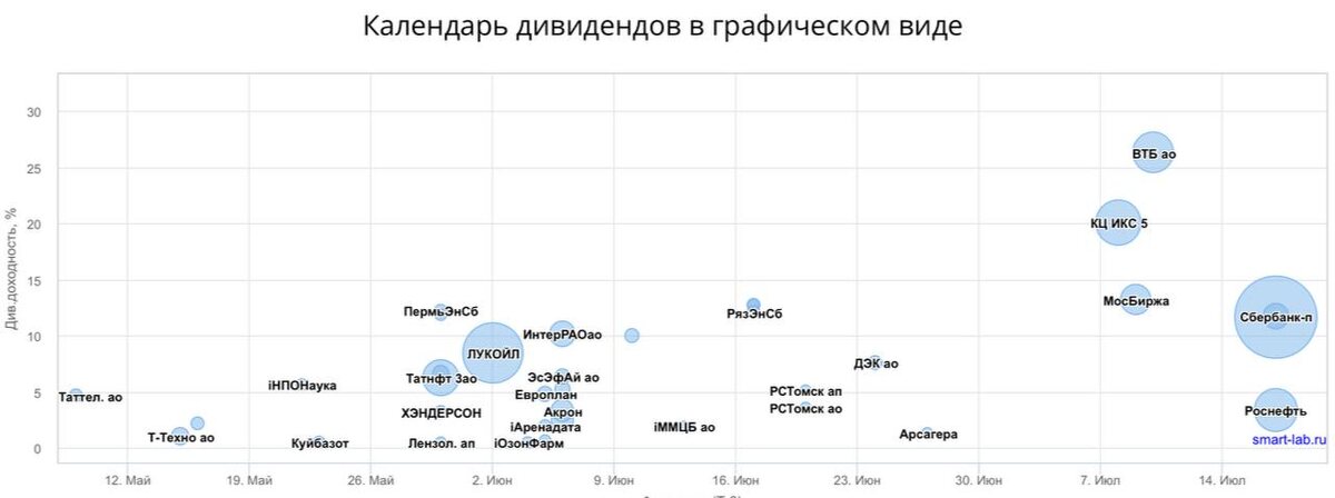 Первая часть в предыдущем посте 🔜 Июнь 2025 (часть 2) 🚗 #SVAV Соллерс — Последний день покупки: 10 июня. Дивиденды: ₽70 на акцию. Доходность: 10,1% 🧬 #GEMA ММЦБ — Последний день покупки: 13 июня. Дивиденды: ₽2,4 на акцию. Доходность: 1,9% 🔜 Июль 2025 🛒 #X5 ИКС 5 — Последний день покупки: 8 июля. Дивиденды: ₽648 на акцию (спецдивиденды). Доходность: 19,4% 🏦 #MOEX Мосбиржа — Последний день покупки: 9 июля. Дивиденды: ₽26,11 на акцию. Доходность: 13,2% 🏦 #VTBR ВТБ — Последний день покупки: 10 июля. Дивиденды: ₽25,58 на акцию. Доходность: 26,4% 🏦 #SBER Сбер — Последний день покупки: 17 июля. Дивиденды: ₽34,84 на акцию. Доходность: 11,4% (обыкн.), 11,5% (прив.) ⛽️ #ROSN Роснефть — Последний день покупки: 17 июля. Дивиденды: ₽14,68 на акцию. Доходность: 3,2% 💭 К этому посту специально приложил очень полезный график, в котором масштаб круга соответствует номинальной величине выплаты, и, как видно невооруженным глазом, выплаты придут в две волны: в первой половине июня и в конце июля