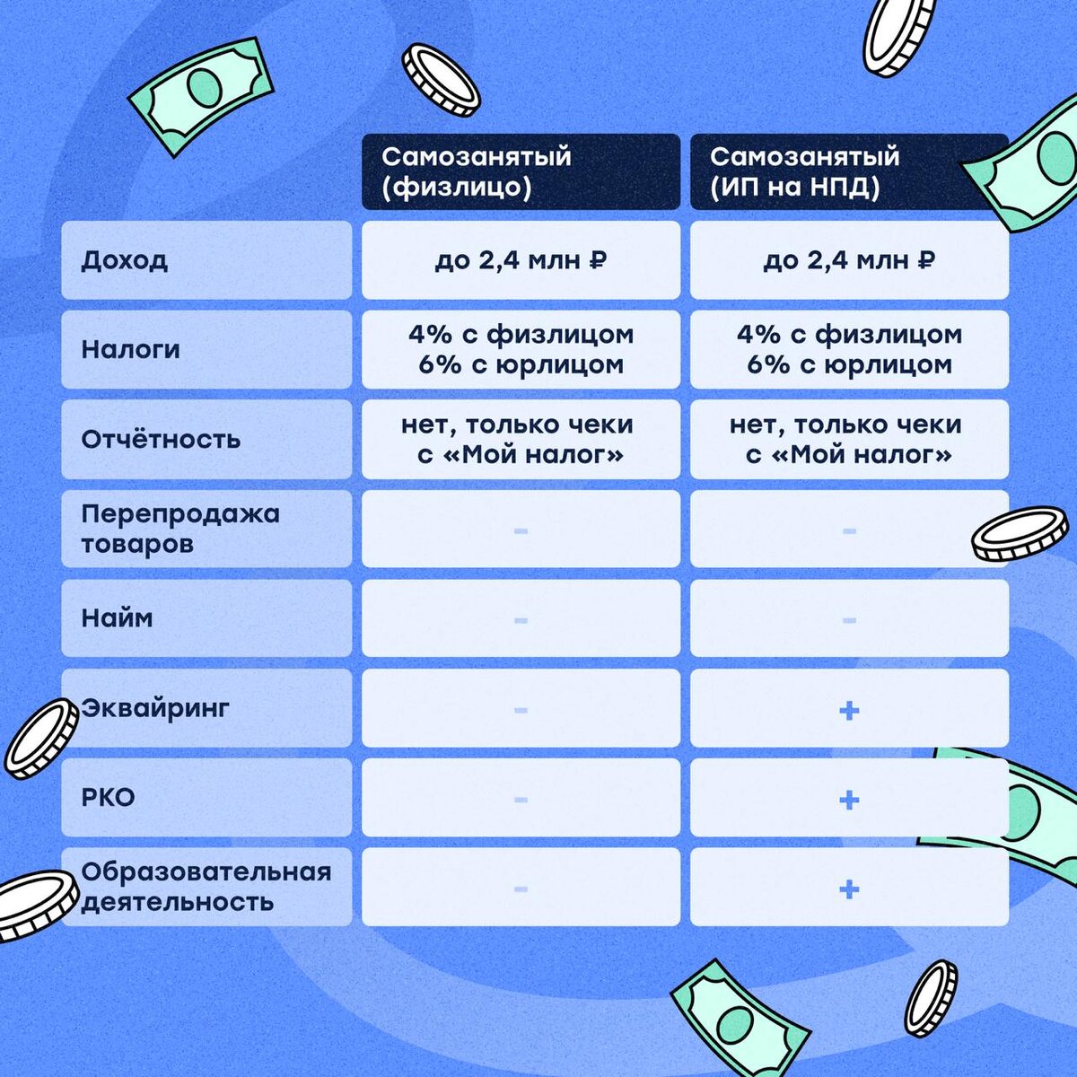 В чём отличия между самозанятым и… самозанятым?👀 Да, всё верно — их действительно два типа. Что вообще такое самозанятость? ➡️Самозанятость — это специальный налоговый режим, официально называется НПД — налог на профессиональный доход. Никакой сложной отчётности, никакого бухучёта — только приложение «Мой налог». Подходит тем, кто работает на себя: эксперты, репетиторы, мастера, фрилансеры и т.д. А теперь, собственно, к двум типам↪️ 1️⃣Первый — самозанятый как физлицо. Простой формат: регистрируетесь в «Мой налог», работаете с клиентами, сдаёте чеки через приложение. Но не можете открыть РКО, подключить эквайринг или заниматься образованием. 2️⃣Второй — ИП на НПД (налог на профессиональный доход). Те же ставки налога, та же отчётность (точнее её отсутствие), но больше возможностей: можно подключить эквайринг, открыть РКО, заниматься образованием, а в случае роста бизнеса — легко перейти на новый налоговый режим. ⬆️На схеме выше — основные отличия в простой форме таблицы. Но глав