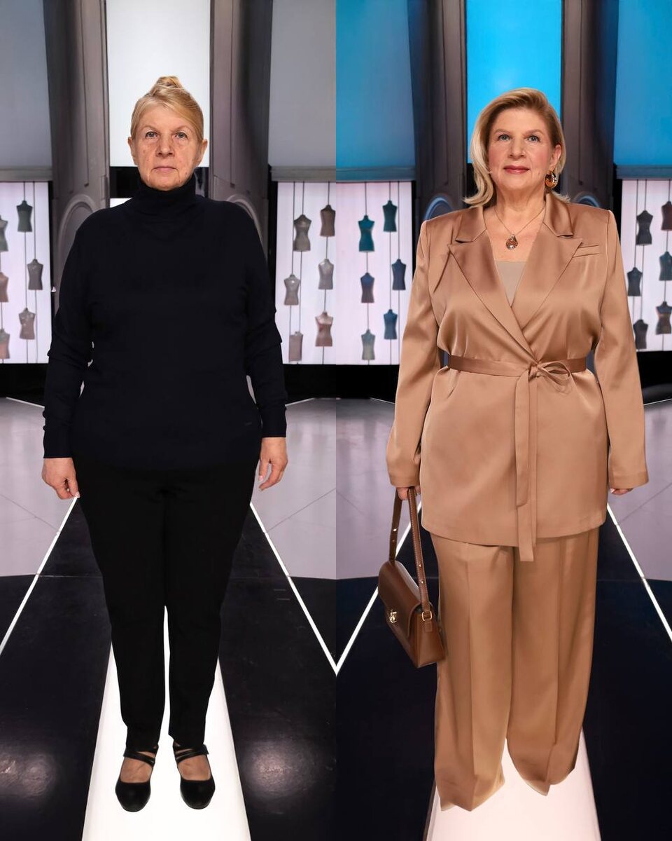 По фотографии "До" можно выделить два основных момента: во-первых, черный цвет не идет героине, а во-вторых, её стройные ноги — это главное преимущество фигуры. Что же сделали стилисты? В первом варианте с бежевым костюмом, несмотря на монохром в образе, визуально фигура была "порезана" дважды — в области талии и чуть ниже бедер. Удлиненный жакет и светлый цвет костюма только усилили этот эффект, сделав бедра более массивными, а ноги — короче. Широкие брюки добавили лишнего объема, в результате чего героиня выглядит на несколько размеров крупнее. Во втором образе контраст длины верха также укоротил ноги, не подчеркивая главное достоинство героини. В итоге получился массивный верх на коротких ногах, хотя её фигура значительно лучше, чем это кажется в выбранных аутфитах. Третий образ оказался наиболее удачным из всех трех, но длину все же стоило бы выбрать чуть выше, чтобы открыть стройные лодыжки. Тогда вся фигура казалась бы стройнее. Сам фасон тоже расширил бедра, но не так критично,