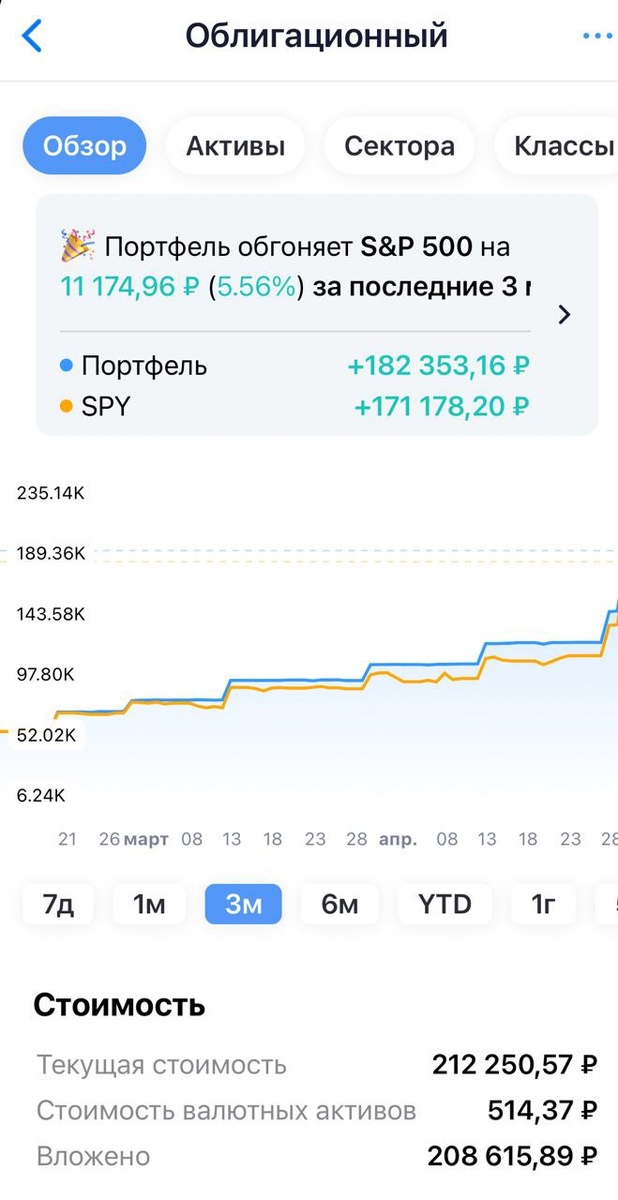 В марте купил облигаций на 54 012,9 ₽ - все операции по облигациям можете видеть тут - snowball-income.com На сегодняшний день вложено 208 615,89 ₽ , за апрель выплачено купонов 2 207,54 ₽ (они конечно же реинвестятся обратно) - растём. Не так быстро, как хотелось бы, но всё же главное расти!! Общий облигационный портфель - 212 250,57 ₽ Было в планах довести до 200 к облигаций Газпром Нефть 003P-08R , затем закупится РЖД. Но увидел не понятные и мрачные звоночки по новому пакету санкций, где вишенкой на торте возможно была бы блокировка перевозок нефти по Балтийскому морю. Поэтому Газпром нефть, Лукойл пока на стоп. РЖД, Биннофарм, X5, Магнит – велком. Всех с наступающими праздниками! 9 мая – великий день! #Фонда@investora_blog