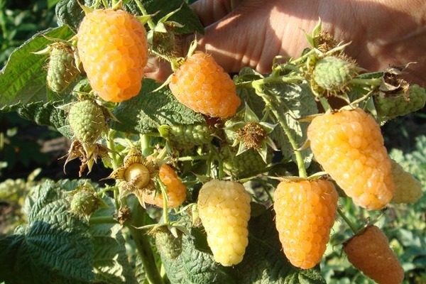 Я удивляюсь необычному жёлтому оттенку этой малины, отдельно отмечаю приятный банановый запах. Но вот без поддержки побеги легко опрокидываются на землю, поэтому я рекомендую их закреплять как можно раньше – сразу при посадке. Первый сбор урожая был небольшой, последующие года малинку просто обсыпало ягодой.