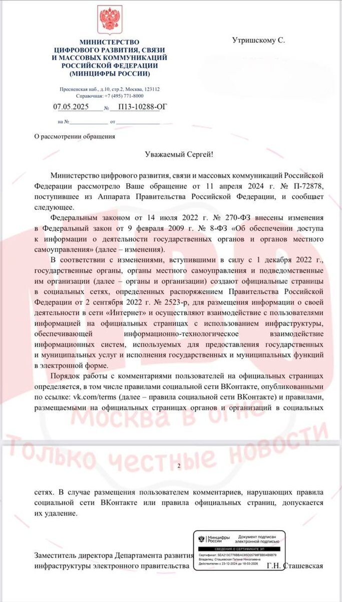 Власти объяснили, почему закрывают комментарии в соцсетях Учредитель МВО Сергей Ильин направил запросы в ряд государственных структур с просьбой разъяснить причины ограничения комментариев на страницах чиновников в социальных сетях. Ответы поступили от Минцифры, а также префектур СЗАО и ЮАО Москвы. В Министерстве цифрового развития сообщили, что работа с комментариями регулируется как внутренними правилами официальных страниц, так и политикой соцсети ВКонтакте. Нарушающие установленные нормы комментарии подлежат удалению. Префектура СЗАО подчеркнула, что модерация комментариев проводится с целью удаления спама, оскорблений и запрещённой информации. Аналогичную позицию выразили в префектуре ЮАО, при этом указав, что не занимаются «корректировкой ответов» в соцсетях. Материал подготовлен на основании официальных ответов органов власти. Прислать новость | Подписаться | boosty