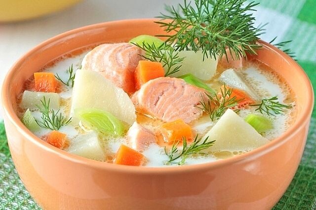 Для приготовления понадобятся : красная рыба , картофель, лук, морковь, сливки - 10%, сливочное масло, соль, перец, душистый перец, лавровый лист. Голову и жабры у рыбы удалить. Из головы варим бульон 40 минут, процедить. Морковь натереть на крупной терке. На сливочном масле обжарить лук, морковь. С рыбы снять шкурку. Нарезать кусочки. Картофель нарезать крупными кусочками. В бульоне поварить картофель 15 минут. Добавить в суп сливочную поджарку , рыбку. На маленьком огне добавить сливки, готовить 10 минут. Добавить зелень. Дать супу настояться. Для приготовления понадобятся: 1 кг рыбного филе, 5 яиц, 3 средних помидора, 200 гр сыра, 100 гр майонеза, 2 головки лука, соль, перец, 2 ст.л. муки, 1 лимон, растительное масло, зелень. Кусочки рыбы посолить, сбрызнуть половинкой лимона. Пусть постоят 15 минут. Обвалять рыбу в муке, обжарить до румяности. В тарелку разбить яйца, соль, перец, зелень, майонез. Взбить венчиком. Сыр натереть ( после морозилки это сделать легче). В форму
