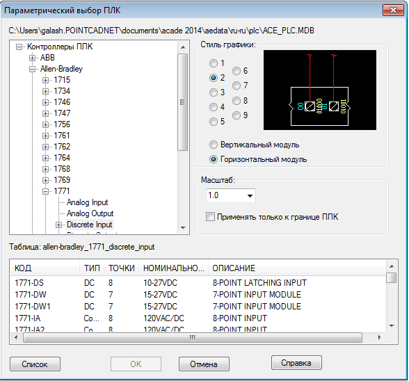 Для размещения на чертеже выбранного модуля ПЛК с заданным стилем графического отображения и масштабом в диалоговом окне «Параметрический выбор ПЛК» следует нажать кнопку ОК.