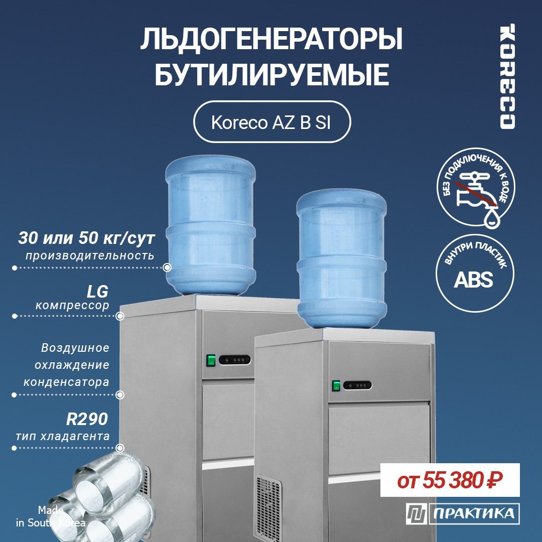 ЛЬДОГЕНЕРАТОРЫ ПАЛЬЧИКОГО ЛЬДА БЕЗ ПОДКЛЮЧЕНИЯ К ВОДЕ KORECO AZ B SI Льдогенераторы KORECO AZ B SI могут использоваться там, где невозможно стационарное подключение к водопроводу и канализации. 5 ПРИЕМУЩЕСТВ БУТИЛИУРЕМЫХ ЛЬДОГЕНЕРАТОРОВ 1️⃣ Мобильность и автономность Не требует стационарного подключения к воде — можно использовать в любом месте, где есть электричество: в летних кафе, в парках, на плаже, в фургоне, на морских судах и т.д. 2️⃣ Простота установки Не нужно прокладывать шланги или устанавливать фильтры — просто вставьте бутыль с водой и включите аппарат. 3️⃣ Легкость в обслуживании и чистке Нет риска засоров и проблем с подключением — резервуар и внутренние элементы проще мыть и обслуживать. 4️⃣ Контроль качества воды Вы сами заливаете воду и можете использовать бутилированную или фильтрованную воду высокого качества, что улучшает вкус и чистоту льда. 5️⃣ Быстрый старт Обычно такие льдогенераторы готовы к работе сразу после включения и залива воды — без длительной п