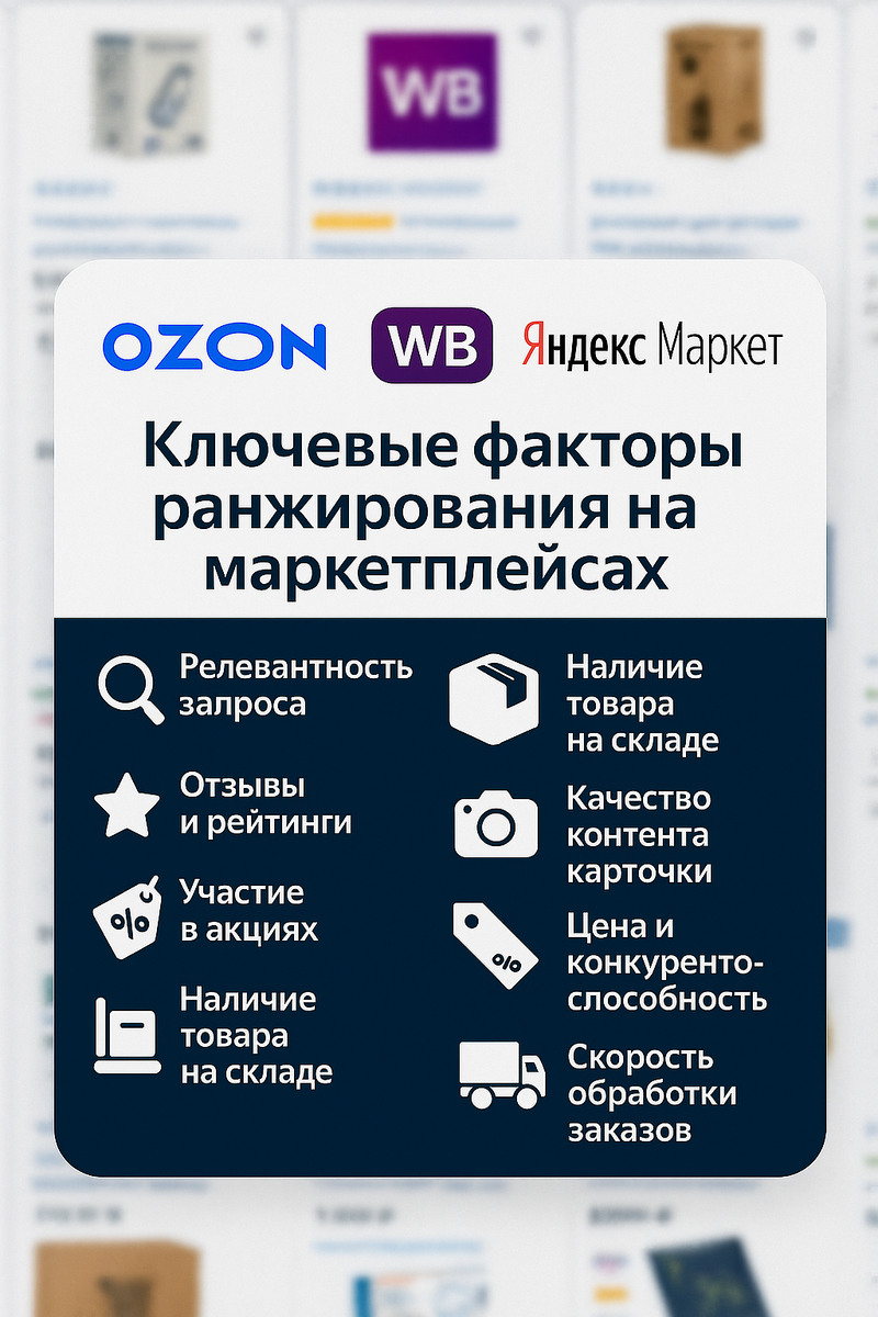 Алгоритмы ранжирования маркетплейсов давно перестали быть загадкой. Ниже — разбор ключевых факторов, которые реально влияют на позиции в выдаче. 🔍 1. Релевантность запроса 📈 2. Продажи и конверсия ⭐ 3. Отзывы и рейтинг 🎯 4. Участие в акциях и скидки 📦 5. Наличие товара на складе 📷 6. Качество карточки 💰 7. Цена и конкуренция 🚚 8. Скорость и сервис 📌 Что делать, чтобы вырасти?