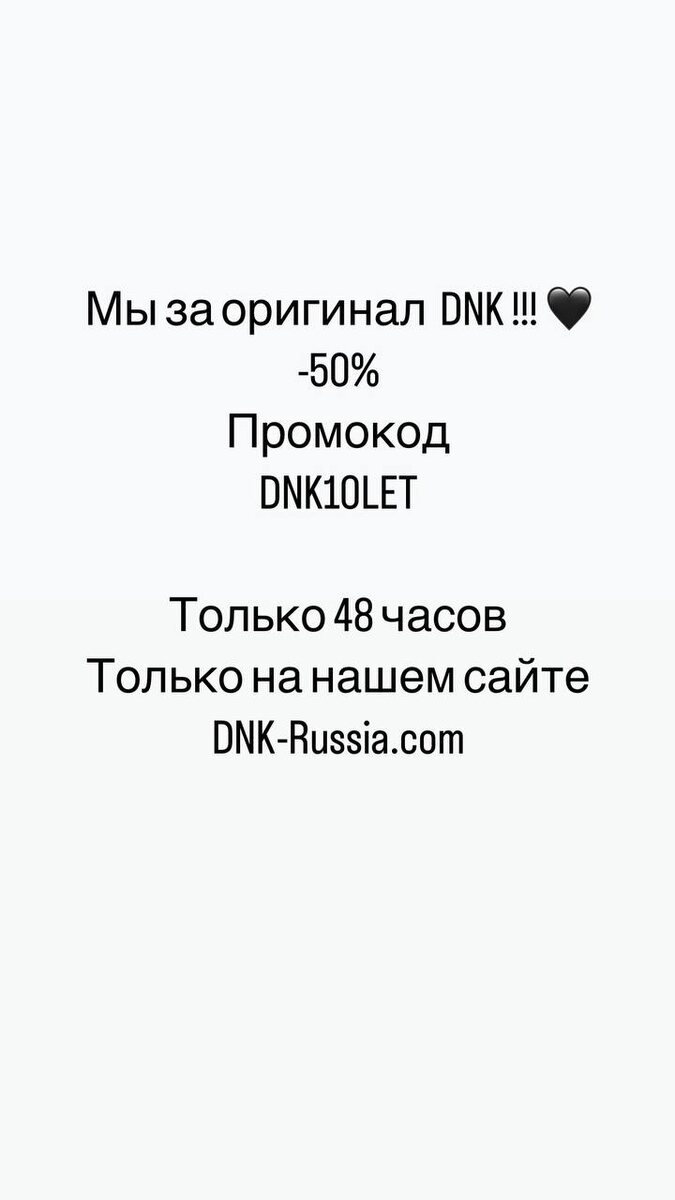 Мы решили, что всем нужны только оригинальные вещи DNK !!! 🖤 Промокод - DNK10LET −50% на всё (кроме капсул ЦСКА, СССР и ГЕРБЫ). Только 48 часов на dnk-russia.com Если нужна помощь - +7 (918) 558-05-18 С любовью, команда DNK. P.S. более подобно на нашей страничке в запрещенной сети. https://www.instagram.com/dnk.russia?igsh=MTBqeHhiZ3I2bTY4dg==