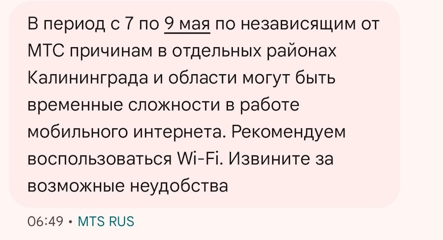 В Калининграде в центральной части города наблюдаются сбои в работе мобильного интернета у операторов связи, сообщили «Новому Калининграду» абоненты МТС, Т2 и «Билайн». Калининградцы отмечают сбои в отправке сообщений в мессенджерах, не грузятся изображения, мобильные приложения, в том числе банковские. Отметим, что абоненты МТС получили рассылку СМС, в которых их предупреждают о возможных проблемах. «В период с 7 по 9 мая по независящим от МТС причинам в отдельных районах Калининградской области могут быть временные сложности в работе мобильного интернета. Рекомендуем воспользоваться Wi-Fi. Извините за возможные неудобства», — говорится в сообщении. Дополнено: как сообщает корреспондент «Нового Калининграда», также отмечаются сбои в работе банкоматов в центре города. Некоторые магазины временно перешли только на наличный расчёт.