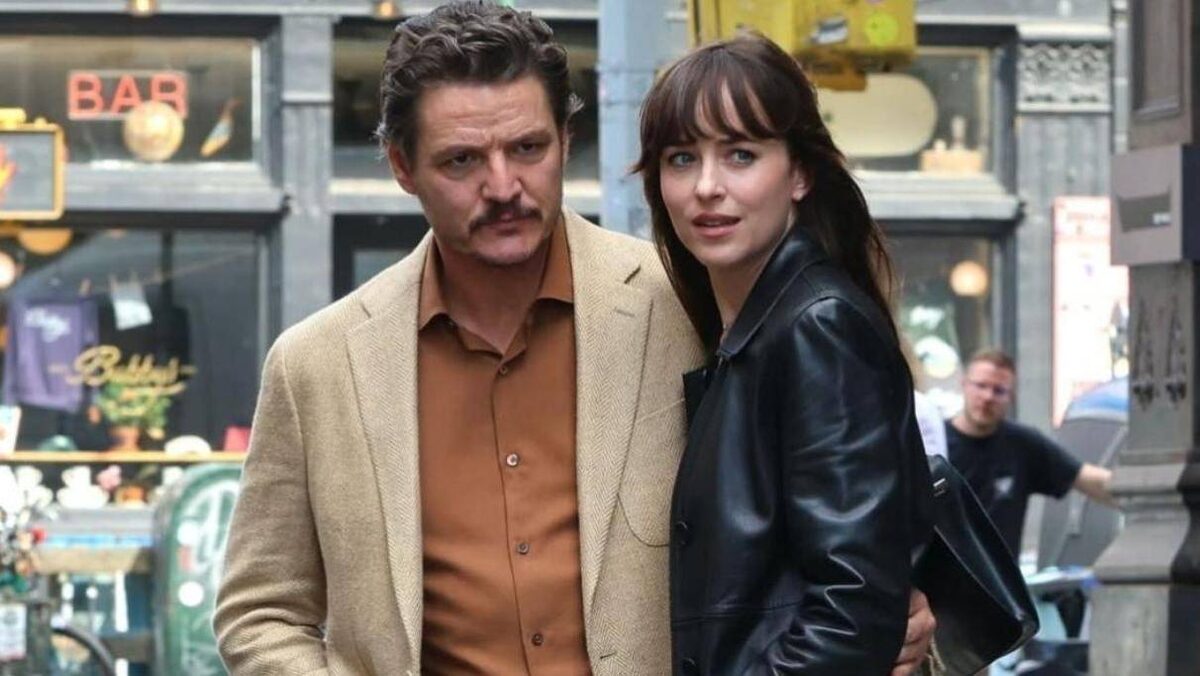 Дакота Джонсон, Крис Эванс и Педро Паскаль на персонажных постерах ромкома «Материалистка»