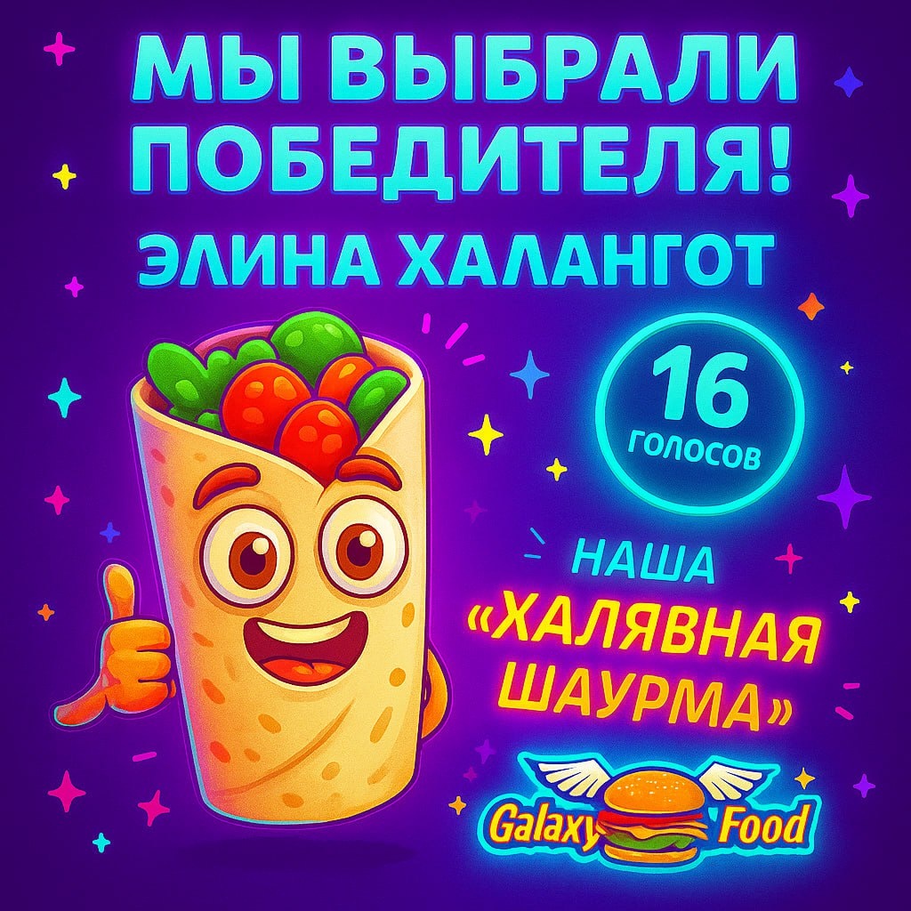 🌯 Победитель акции "Халявная шаурма" — определён! 🌯 Друзья, вы настоящие! 🙌 Мы получили кучу реакций, и голосование прошло на космическом уровне. Спасибо каждому, кто участвовал! 💛 🎉 С радостью объявляем: 🏆 Победила — Элина Халангот! Её отзыв собрал 16 голосов, и мы полностью согласны с вами: это было вкусно написано 😋 💬 «Шикарное место, которое можно смело рекомендовать абсолютно всем…» 🔥 Элина получает заслуженный приз — халявную шаурму от Galaxy Food! И, конечно, внимание и любовь всего канала. Оставайтесь с нами — и готовьтесь к следующей акции 😉 #ГалаксиФуд #Победитель #ХалявнаяШаурма #Отзывы #ВыборПодписчиков