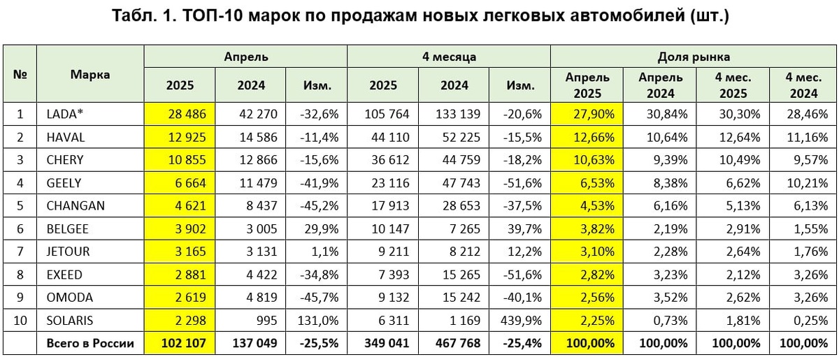 Традиционный для начала месяца пост в партнерстве с агентством "Автостат" - итоги продаж новых легковых автомобилей в России за предыдущий период. "В апреле 2025 года в России было реализовано более 102 тысяч новых легковых машин. Да, это на четверть меньше, чем год назад, но на 28% выше показателя марта. К тому же впервые в нынешнем году авторынок преодолел 100-тысячную отметку", - предварили соответствующие данные коллеги из агентства. В табличке с топ-10 это не совсем очевидно, а вот в рейтинге топ-15 четко показано, что все марки-лидеры добились существенного роста относительно марта. Особенно динамично вырос Exeed - говорят, что благодаря крупной флит-сделке. Но есть успешные бренды и в сравнении с АППГ - Belgee, GAC и Jetour. Первые два уже вышли в плюс по итогам января-апреля. Однако удастся ли удержать эти высоты, не знают даже аналитики. Еще несколько фактов: ✅ В сравнении с мартом 2025-го из топ-10 вылетел Jaecoo, уступивший место "Эксиду". ✅ Chery и Haval на падающем ры