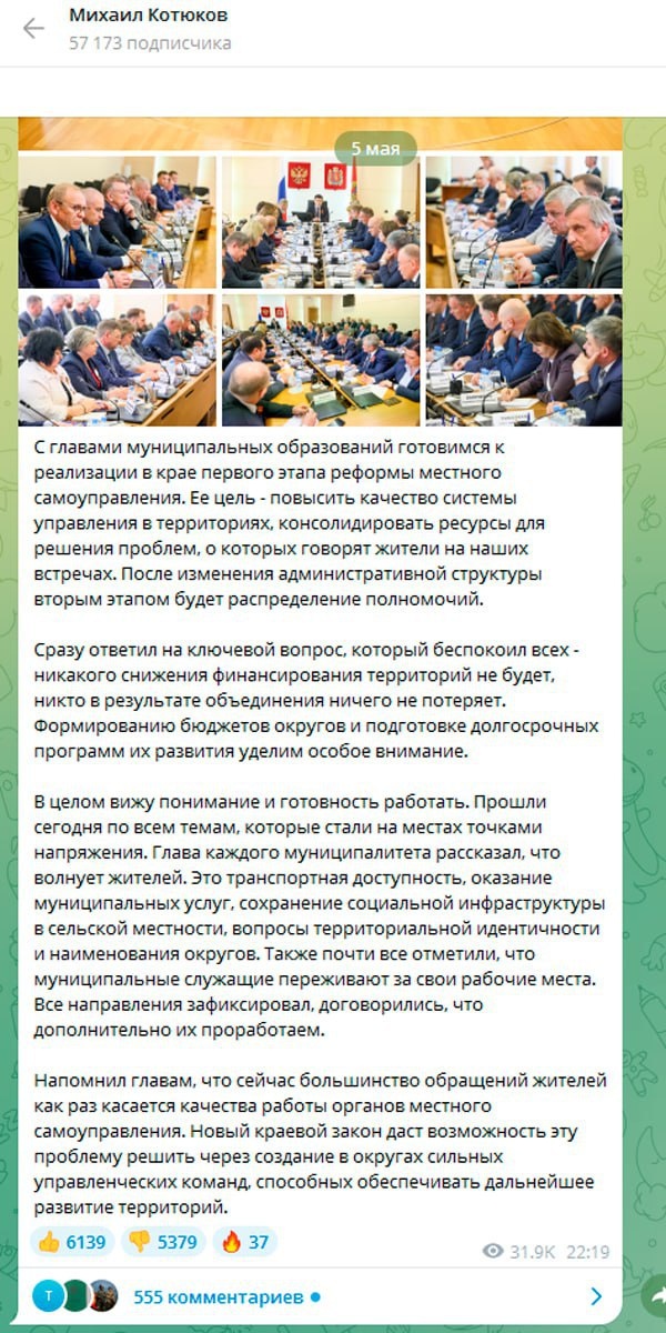 Тысячи лайков вдруг появились под публикацией губернатора Красноярского края Михаила Котюкова в Телеграм-канале, которая оправдывает муниципальную реформу в регионе, пишет "Сибирский Экспресс" и напоминает: жители уже вторую неделю записывают массовые обращения против законопроекта. Подробнее: https://krasrab.ru/news/vlast/46126