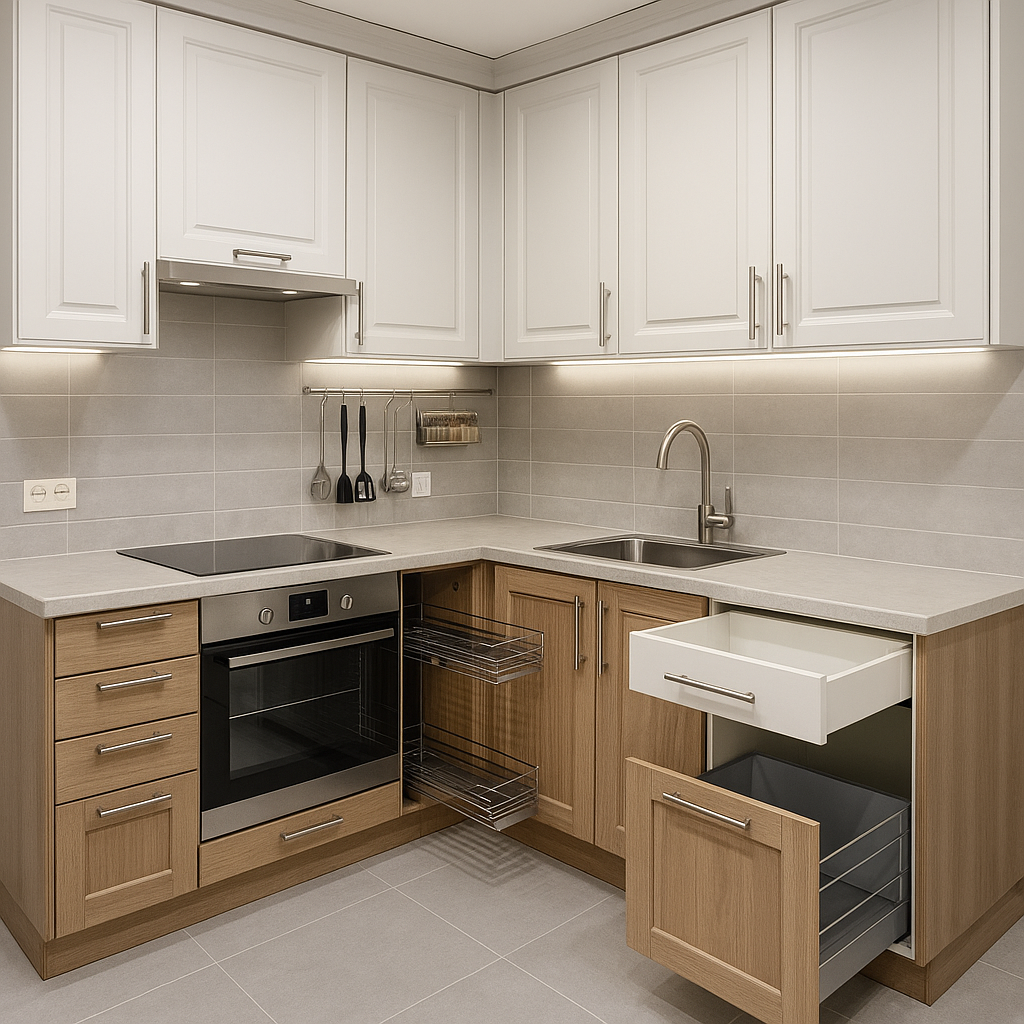 Грамотно организованная кухня — это не только эстетика, но и практичность. В условиях современной жизни, особенно если кухня не отличается большим метражом, важно, чтобы каждая вещь имела своё место, а готовка приносила удовольствие, а не хаос. Один из основных принципов — рабочий треугольник: плита, раковина и холодильник. Эти зоны должны находиться на минимальном расстоянии друг от друга, образуя условный треугольник. Так вы сэкономите шаги и ускорите процессы готовки. Разделите кухню на функциональные зоны: Храните нужные вещи в той зоне, где вы их используете. Например, кастрюли — рядом с плитой, моющее средство — под мойкой. Верх — ваш лучший друг. Используйте: Так вы освободите столешницу от лишнего и сделаете интерьер более лёгким визуально. Внутренние выдвижные ящики с разделителями позволяют удобно разложить: Современная фурнитура — от Blum, Hettich и аналогов — позволяет сделать выдвижные полки даже в угловых зонах. Углы на кухне не должны пустовать. Используйте: Встраиваемая