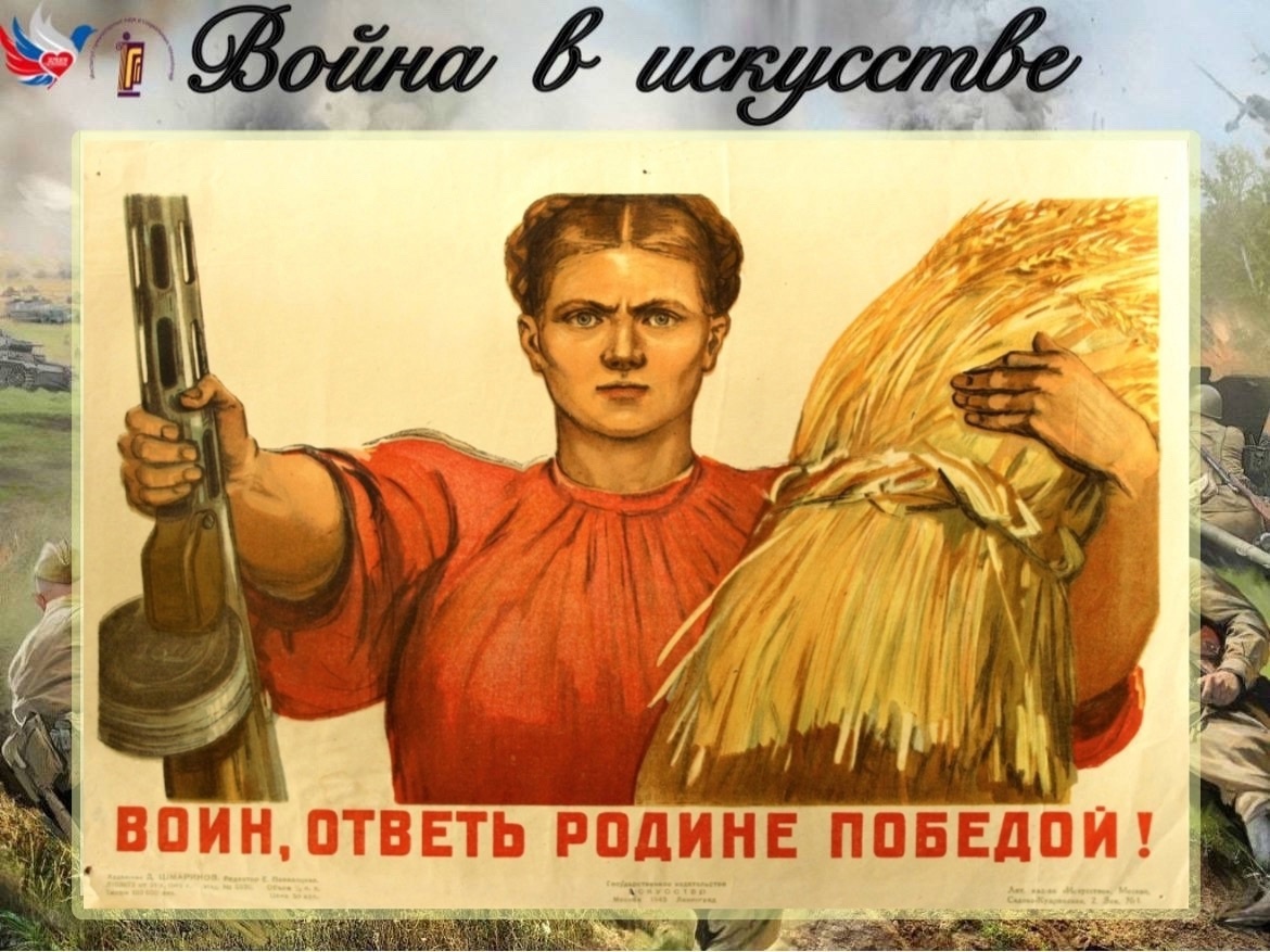 Институт гуманитарных наук и социальных технологий при участии патриотического клуба КГУ «Сердцем с Россией» представляет вашему вниманию продолжение проекта «Война в искусстве» с участием студентов 1 курса КГУ. Известно ли вам, что в советское время плакаты были одним из самых распространенных средств массовой агитации? Советские плакаты времен Великой Отечественной войны 1941-1945 годов призывали всех людей необъятной страны выступить против фашизма. Одним из ярких примеров стал плакат Дементия Алексеевича Шмаринова «Воин, ответь Родине победой!» (1943 г.). На плакате изображена женщина в красном платье, олицетворяющая Родину. Она держит в одной руке сноп пшеницы, а другой рукой протягивает автомат. Женщина призывает идти на фронт и защищать свою Родину, а она сумеет вырастить хлеб и накормить воинов. Плакат показывает, что центром единения фронта и тыла есть сама Родина и необходимость её защиты от коварного врага. Этот плакат стал не просто призывом к действию, а символом единства