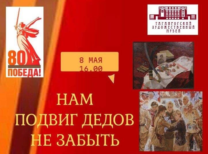 В рамках мероприятия пройдет выставка картин современных художников. В Таганрогском художественном музее в четверг, 8 мая. состоится праздник «Этих дней не смолкнет слава», посвященный 80-летию со Дня Победы советского народа в Великой Отечественной войне. «Вас ждет интересная и разнообразная программа мероприятий, экскурсий, мастер-классов для детей» — говорится в сообщении на сайте музея. В рамках праздника, который начнется в 10 часов, состоится художественно-музыкальное мероприятие «Нам подвиг дедов не забыть». «Приглашаем всех в 16:00 вспомнить страницы огненных лет, послушать любимые песни в исполнении коллективов молодых музыкантов, познакомиться с картинами выставки «Подвиг в сердцах поколений» художников 20-21 веков» — пригласили сотрудники Художественного музея горожан. Всех желающих ждут по адресу: ул. Александровская, 56. Полная программа праздника.