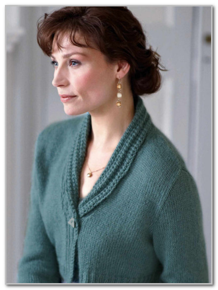 Этот дизайн от Сары Хаттон имеет винтажный вид и связан в чулочной вязке. Контраст создается благодаря небольшому кружевному воротнику, который вяжется в две части и соединяется на спинке шеи. Сара использовала пряжу Rowan Kid Classic, мягкую смесь ламбсовой шерсти и мохера, которая доступна в 30 элегантных оттенках.