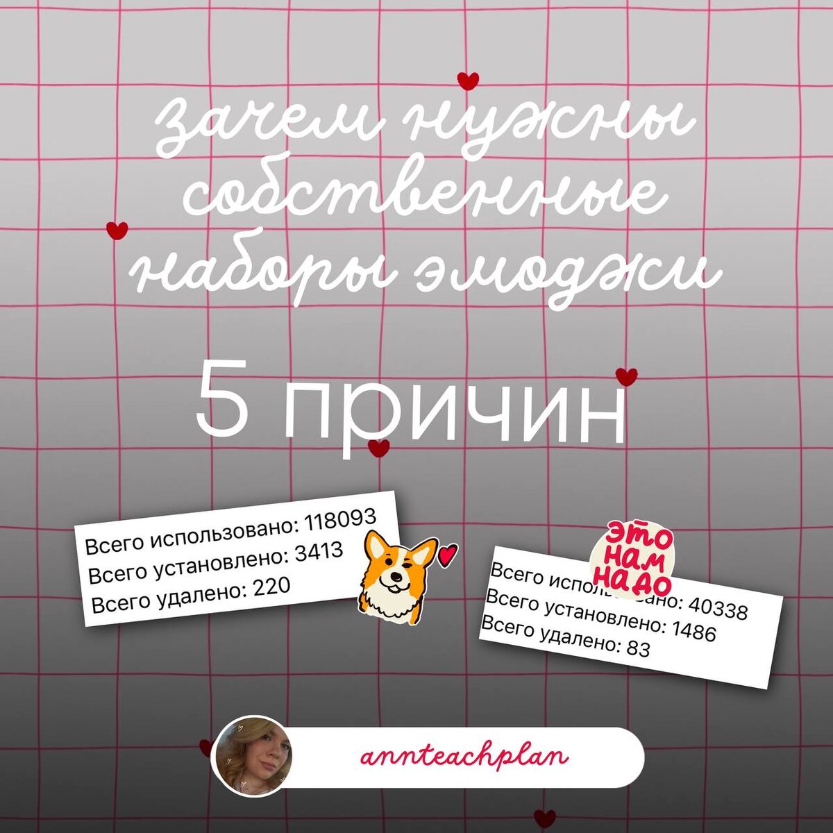 ~ 5 причин зачем нужны собственные наборы эмоджи На этой неделе мы обсуждали с вами, какое впечатление производят наши блоги. И эмоджи - часть нашего визуала, который говорит за нас. 1️⃣Часть визуала и бренда В огромной ленте можно потеряться, но фирменный эмоджи помогает зацепиться взгляду и понять, что вижу 😀 - это пост Ани. 2️⃣Добавляет акцентов тексту Встроенные эмоджи ограничены, мало тех, которые можно использовать для оформления. А мы все любим все эти красивые стрелочки и точки🆓↩️🫧 3️⃣Помогает выразить эмоции Тут очень похоже с первым пунктом. Я уже не представляю свои переписки без 😱😆🆒🍦 4️⃣Узнаваемость У всех моих наборов в названии есть ссылка на канал. А это - лишняя реклама и продвижение. В обложке прикреплена статистика моих самых популярных наборов - впечатляет! 5️⃣Просто приятно Каждый раз, когда я вижу свои эмоджи в постах других коллег, мое сердечко замирает, вот честно! 💞А я очень часто вижу свои наборы даже у тех, на кого я не подписана. А как-то я нат