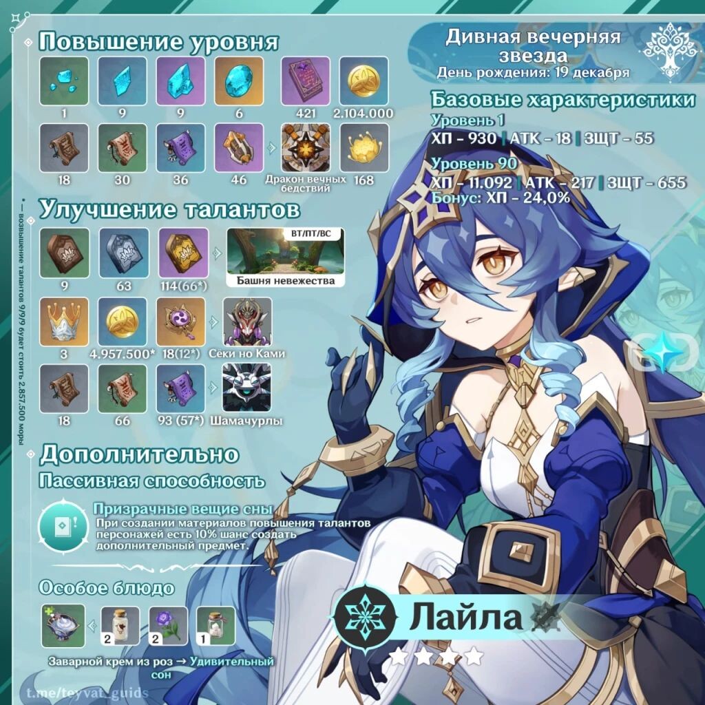 ㅤЛайла — персонаж эпической редкости с Крио Глазом Бога, которая использует в бою одноручный меч. Она является саппортом, который не только даёт щиты, но и поможет с Крио статусом и восстановлением энергии. ㅤПо сюжету она студентка Академии, которая усердно учится, чтобы достойно закончить обучение, но из-за этого она страдает от сильного недосыпа, тем более, что когда она спит, просыпается её другая личность. ㅤЭто статья о том, как собрать Лайлу и как за неё играть! ㅤОбычная атака наносит до трёх ударов мечом. ㅤЭлементальный навык создаёт щит и наносит Крио урон по области. Прочность щита зависит от показателя макс. HP Лайлы, и он на 250% эффективнее поглощает Крио урон. При активации щита, Лайла на короткое время получает Крио статус. Такой щит создаёт Ночные звёзды, по одной в 1.5 секунд. Также создаётся две Ночные звезды, когда активный герой под его защитой использует элементальный навык, раз в 0.3 секунды. Максимальное количество Ночных звёзд — 4.