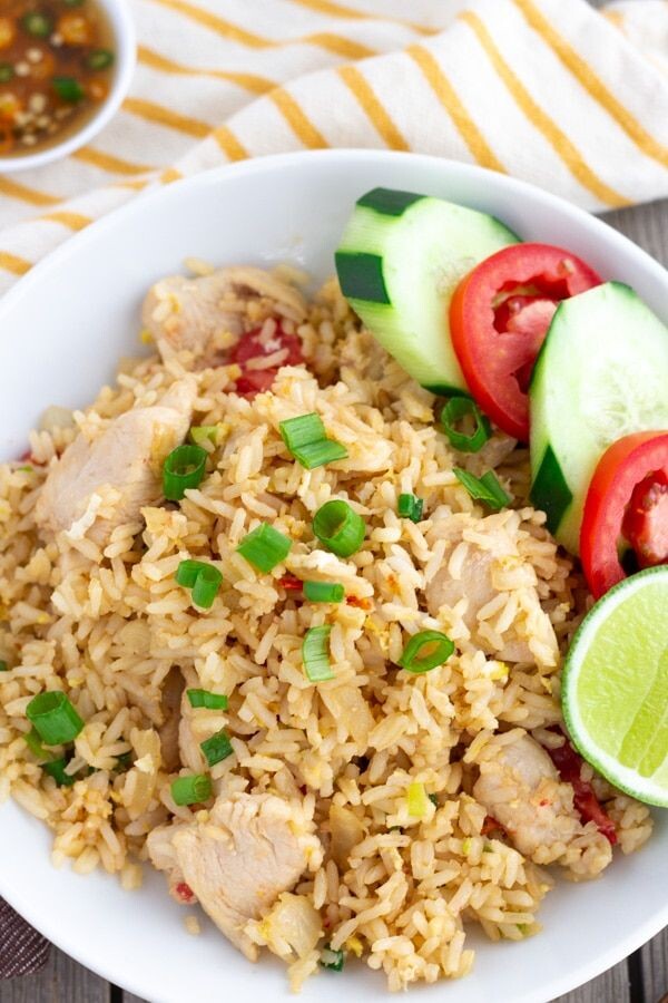 Состав: Рис 1 стакан -– отварить заранее. Все остальное рассчитано на этот 1 стакан сухого риса. Чеснок – 1 - 2 зубчика. Растительное масло для обжарки Лук – 1 луковица среднего размера Куринная грудка ½ (200 грамм) Морковка 1 штука Помидор 1 штука (жидкую мякоть лучше убрать) Перец болгарский ½ Лайм ½ Яйцо 1-2 штуки Зеленый лук – 5-6 перышек Соевый соус 2-3 ст. ложки (вместо соли по вкусу) Сахар 1-2 ч. ложки, по вкусу Перец молотый по вкусу Все овощи нарезать мелкими кубиками, зеленый лук нашинковать (можно добавить любимую всеми кинзу). Куриное филе нарезать мелкими кусочками – 2х2 см. можно резать тонкими слайсами (пластинками). Чеснок порезать или раздавить ножом. На раскаленной сковороде с маслом обжарить чеснок, добавить лук, обжарить до золотистого цвета (это займет времени не больше минуты). Следующая на жарку идет курица, тут минуты 3-4 нужно, смотря сколько у вас курицы и как мелко вы ее порезали. Затем добавляем овощи, все перемешиваем. Потом сдвигаем все к краю, разбиваем н