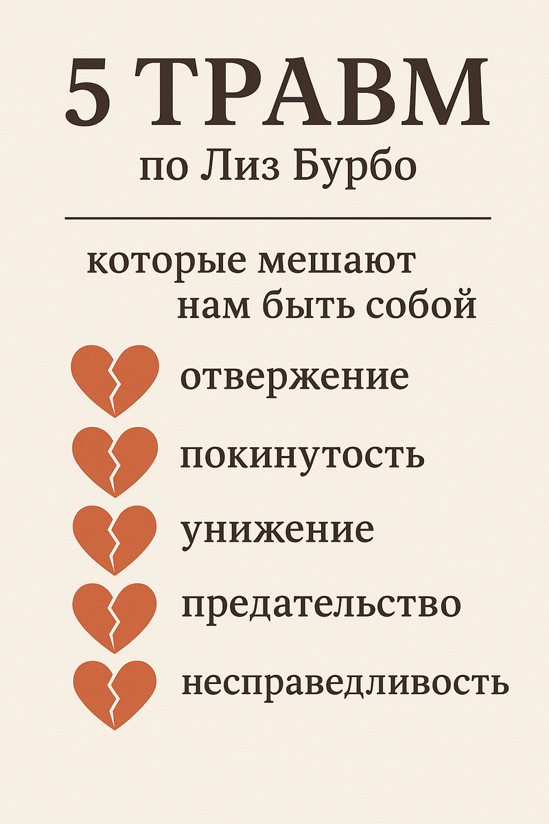 Ты когда-нибудь ловила себя на мысли: «Почему я снова в этой ситуации?», «Почему я так боюсь близости?», «Почему я реагирую так остро, будто мне снова 5 лет?» Ответы могут быть глубже, чем кажется. Внутри нас живут раны. Настоящие. Невидимые, но болезненные. Лиз Бурбо назвала их пятью главными травмами, которые мы носим с детства — до тех пор, пока не начнём их замечать и исцелять. Это не диагнозы, не ярлыки. Это карты к себе. Давай разберём каждую. Это как если бы тебя не просто не приняли — а как будто ты не имела права быть. Всё в тебе — чувства, желания, даже существование — казалось «слишком» или «неуместным». Часто эта рана формируется очень рано, даже до рождения. Родитель мог быть эмоционально холодным, подавленным, в стрессе — и у ребёнка возникало ощущение: «Меня не хотят. Я лишняя». Поведение: Человек с этой раной часто «исчезает» — уходит в фантазии, боится заявить о себе, страшится быть отвергнутым. Может сам саботировать отношения, прежде чем его "выгонят". Как исцелять: