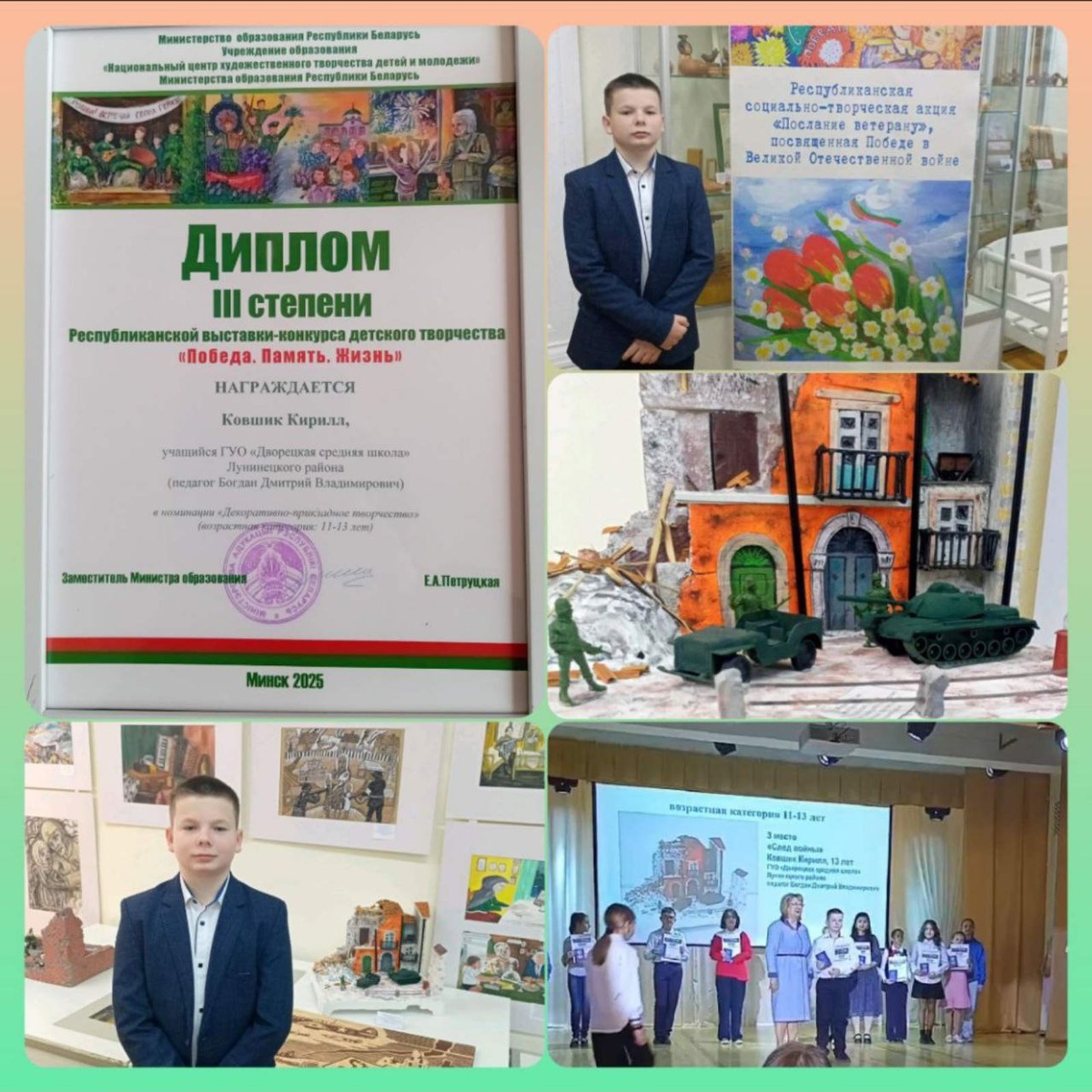 Ковшик Максим, учащийся объединения по интересам "Творческая мастерская" ГУО "Дворецкая средняя школа" Лунинецкого района среди победителей Республиканской выставки-конкурса детского творчества "Победа. Память. Жизнь". Посмотреть TikTok | VK | OK | Instagram | Сайт| Прислать новость