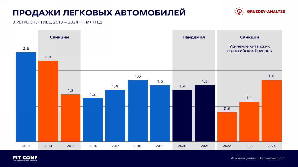 В 2014 и 2015 годах на авторынок повлияли санкции (количество проданных машин упало до 1,3 млн шт.), в 2020-м и 2021-м — пандемия. Сразу же после этого, в 2022–2024 годах, на авторынок обрушились новые санкции, большинство именитых мировых марок покинули Россию, а на их место пришли бренды из Поднебесной.
