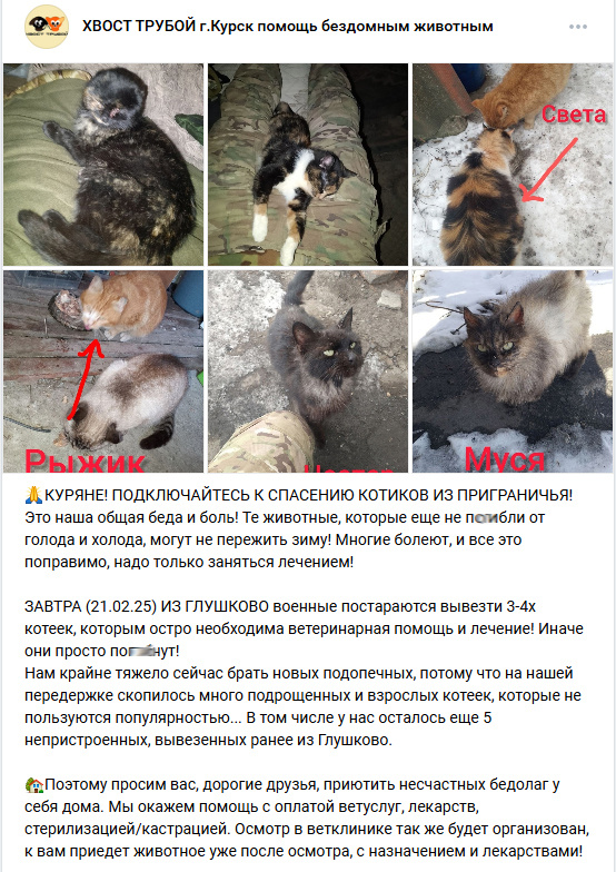 Мультик - один из множества котиков, которых хозяева оставили в приграничье, в спешке покидая свои дома в связи с августовскими событиями. На нашем канале есть две статьи, посвященные теме вывоза животных из зоны неспокойных действий. О наших новых подопечных, привезенных оттуда мы рассказывали здесь: Но вернемся к Мультику. Он вместе с десятком других оставленных котеек прибился к блиндажу наших защитников. Ребята подкармливали хвостиков как могли, некоторых даже брали в тепло, но разрешено было отогревать всего по двое. Помимо кормления, животным требовалось и лечение и ребята готовы были доставить несколько самых нуждающихся хвостиков в Курск. Мы разместили в своих соцсетях объявление о поиске передержки. Но, к сожалению, желающих принять в семью больных котеек, лечение которых мы готовы были оплачивать, не нашлось... Мы приняли 4х нуждающихся в лечении хвостов, среди которых был и Мультик, который на фото отмечен как "Рыжик". Имя Мультик ему придумалось немного позже, уже на перед