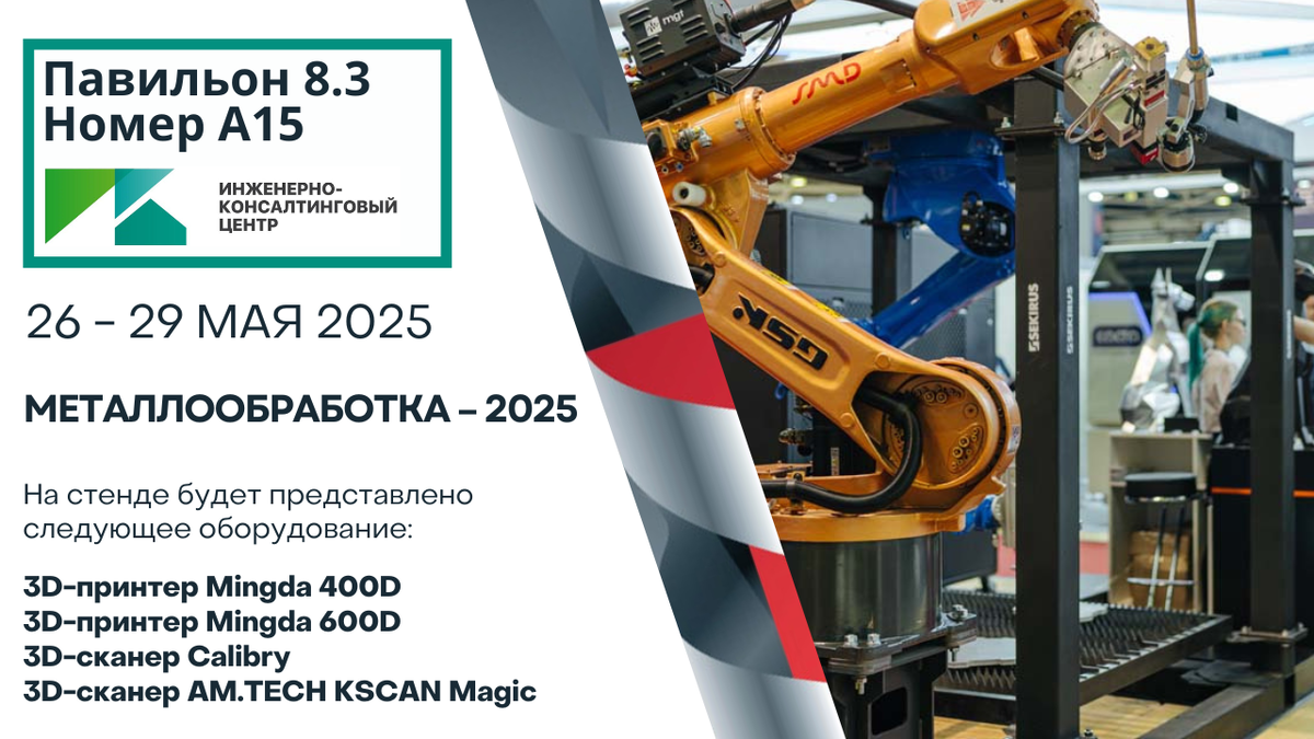 Уважаемые коллеги и партнеры! Инженерно-консалтинговый центр (ИКЦ) станет участником крупнейшей отраслевой выставки России – Оборудование, приборы и инструменты для металлообрабатывающей промышленности «Металлообработка – 2025», которая в этом году пройдёт с 26 по 29 мая в московском ЦВК «Экспоцентр». В павильоне 8.3 на стенде номер А15 будет представлено следующее оборудование: - 3D-принтер Mingda MD-400D - 3D-принтер Mingda MD-600D - 3D-сканер Calibry - 3D-сканер KSCAN Magic Специалисты ИКЦ продемонстрируют аддитивное оборудование в работе, а также мы рады обсудить ваши задачи и предложить индивидуальные решения, которые помогут вашему бизнесу стать более эффективным и конкурентоспособным. Приглашаем вас посетить наш стенд на выставке и погрузиться в мир Индустрии 4.0 – аддитивных технологий и 3D-сканирования. Получить свой билет на выставку можно бесплатно и уже сейчас по ссылке https://www.metobr-expo.ru/ru/visitors/ticket/