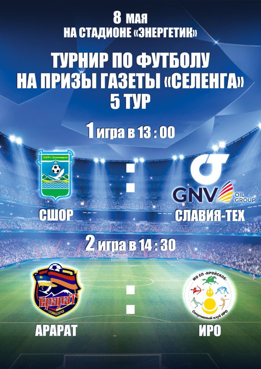 ⚽️Футбольный турнир на призы газеты «Селенга» продолжается! 8 мая, на стадионе «Энергетик» состоится пятый тур турнира по футболу на призы газеты «Селенга». ⏱Расписание матчей: 13:00 - Команды «СШОР» vs «Славия Тех»; 14:30 - Команды «АРАРАТ» vs «ИРО». 👏Ждём всех любителей футбола на трибунах! Поддержим команды вместе! 🫡Администрация Селенгинского района. Подписаться