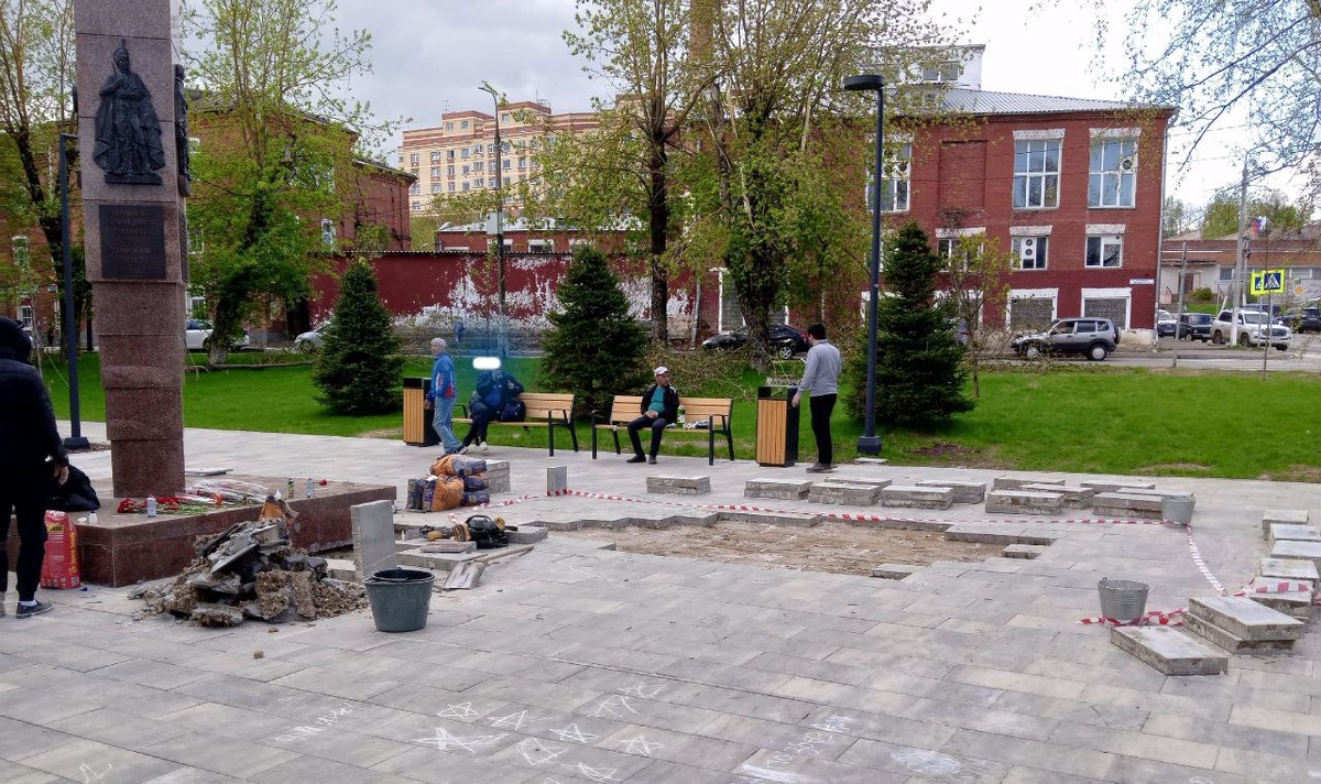 Зимой эту плитку клали рабочие прямо в снег, хрен пойми как. А сейчас, 7мая, перекладывают, по новой. Так можно и каждые полгода по-новой плитку у стелы перекладывать.