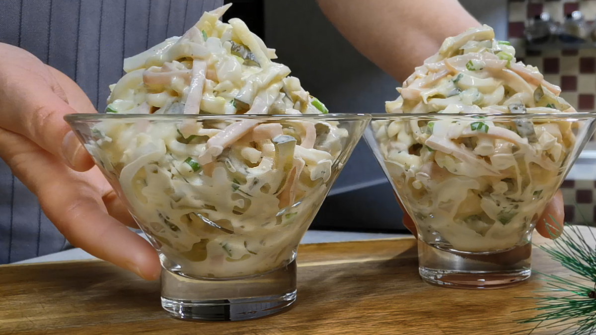 Салат невероятно вкусный, нежный и очень оригинальный. То, что в нем есть ветчина, совершенно невозможно понять. Но сочетается она с главным продуктом блестяще. И после того, как попробуешь, уже не остается никаких сомнений, что готовить нужно именно так, а не иначе.