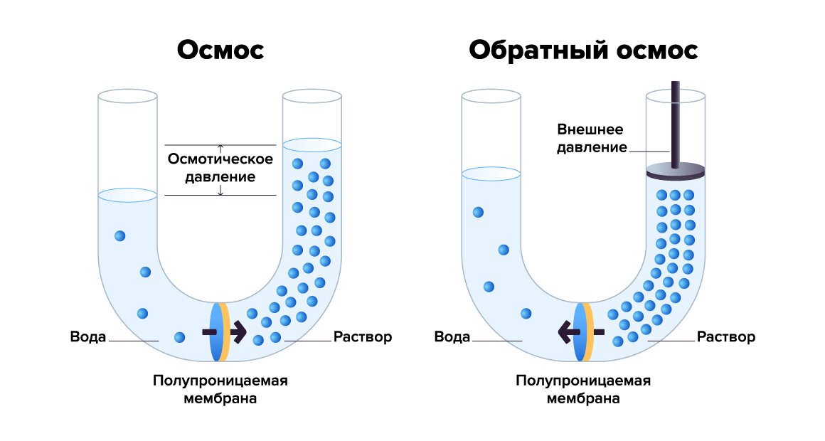 А суть, на самом деле, проста и очень интересна, потому что если, наоборот, в той части сосуда, где концентрация растворённых веществ высока, создать достаточно высокое давление, то растворитель начнёт через тут самую мембрану переходить в другую часть, где растворённого вещества мало. То есть концентрация веществ в одном месте, где она и так высока, увеличится ещё больше, а в другом, где она низка, понизится ещё сильнее. Фактически, таким образом можно "выжать" из солёной воды пресную.