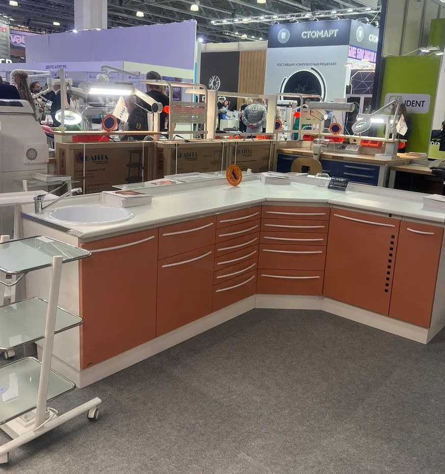 Комбинированный модуль, кресла для врача и пациента, навесные системы хранения. Всё под рукой, ничего не мешает движению.